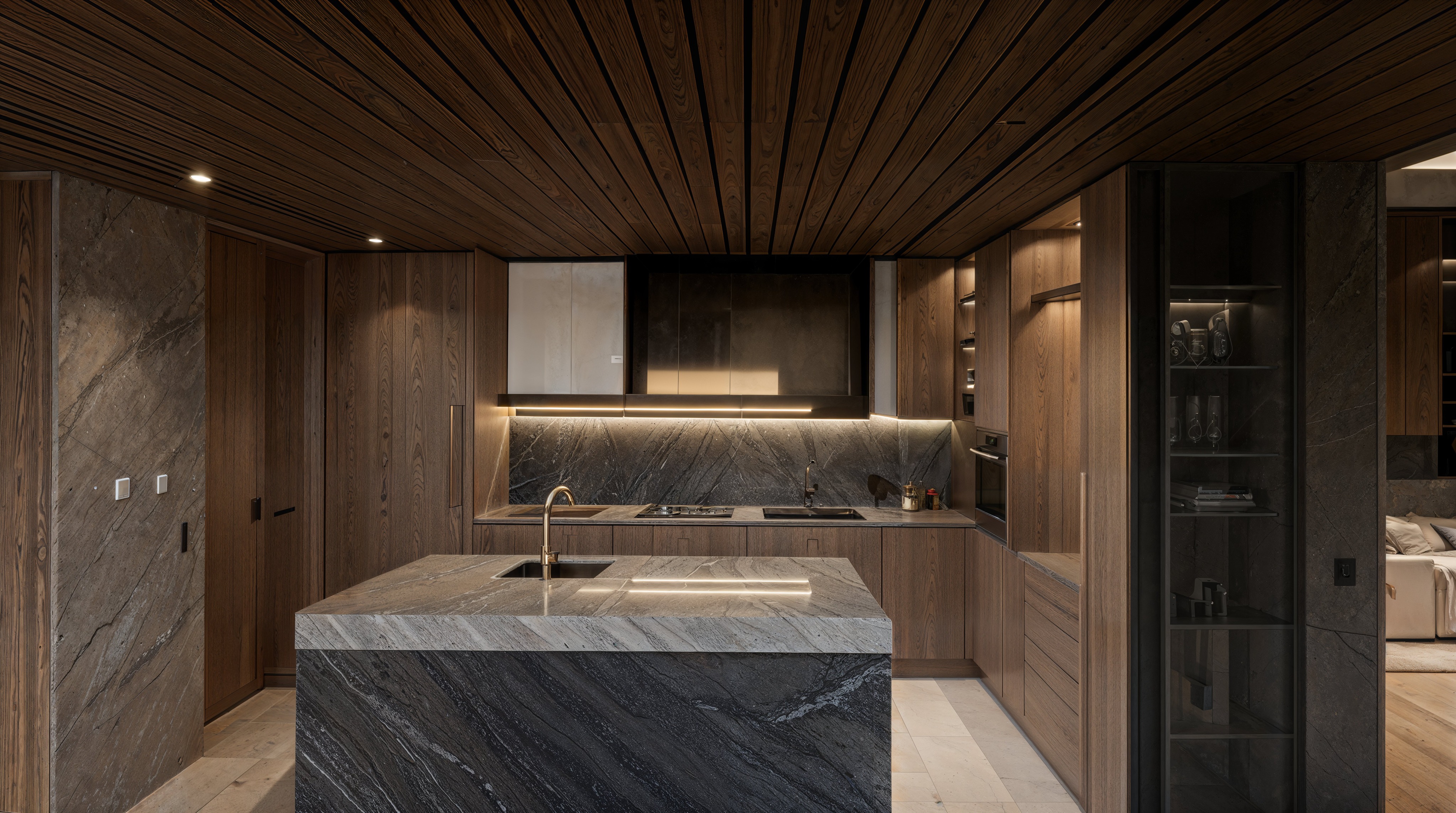 oto zmodyfikowany prompt dostosowany do opisu zdj cia kt re przes a e nowoczesna kuchnia z ciemnymi drewnianymi szafkami czarnym marmurowym blatem o falistych smugach okapem piecami ro linami i szk em w tle zachowa em struktur oryginalnego promptu podkre laj c fotorealizm i niedoskona o ci ale opisa em dok adnie elementy z twojego obrazu by lepiej pasowa zmodyfikowany prompt dla gemini ai text photorealistic interior prompt gemini ai create an ultra photorealistic photograph of a modern kitchen with dark wood cabinetry and black marble countertops featuring wavy veining the image must look indistinguishable from a real photograph not a cgi render camera and photographic characteristics shot on a full frame camera with a wide angle lens 16 24mm natural perspective exaggeration typical of architectural photography viewed from one end of the kitchen toward the glass wall slight lens distortion near frame edges shallow but realistic depth of field foreground countertops slightly softer than the center subtle digital sensor noise in darker areas like cabinet shadows minor chromatic aberration on high contrast edges like countertop veins natural exposure realistic dynamic range no artificial hdr look architecture and materials high dark wood walnut toned cabinets and island with matte finish vertical grain patterns subtle imperfections in wood texture long l shaped black sintered stone or marble countertop and backsplash with organic irregular wavy black veins on gray base uneven polishing some areas glossier double black wall ovens microwaves embedded in cabinetry modern black range hood above cooktop black faucet and small appliances kettle glass fronted cabinets on right revealing shelves with dishes and decor natural wood flooring with random grain and soft reflections ceiling with exposed wood beams and integrated linear led strips large glass doors windows on right revealing greenery outside dark leather sofa visible in background matte and semi matte finishes no perfect surfaces visible wood pores stone micro cracks lighting critical for realism warm linear led strips in ceiling beams with subtle glow and bloom downlights embedded in countertop edge and ceiling soft natural daylight filtering through glass wall casting directional reflections on glossy countertop veins realistic shadow gradients from cabinets onto floor and island soft contact shadows subtle light bounce between wood stone and glass mirror key realism element adapted to glass reflections glass cabinet doors and large window reflecting pendant like lights wood beams and room interior with accurate perspective reflections show proper angular shift and edge thickness outdoor greenery faintly mirrored with light falloff lived in details bowl of yellow fruits apples lemons herbs and small vase casually on island open bottle or jar near sink utensils nearby slightly ajar drawer or cabinet door imperfect object alignment no staged perfection wall mounted elements like outlets with subtle wear light behavior and surface interaction realistic light falloff across dark walls and cabinets soft contact shadows under island and cabinets subtle vein reflections on countertop from overhead lights and window physically accurate material response wood absorbs light softly stone reflects directionally no cgi smoothness style keywords ultra photorealistic architectural photography interior photography full frame camera wide angle lens natural lighting imperfect realism physically accurate materials real world imperfections not cgi not render not artificial true photographic look