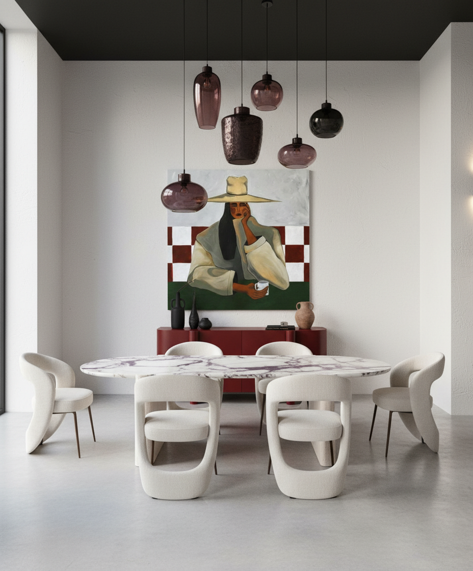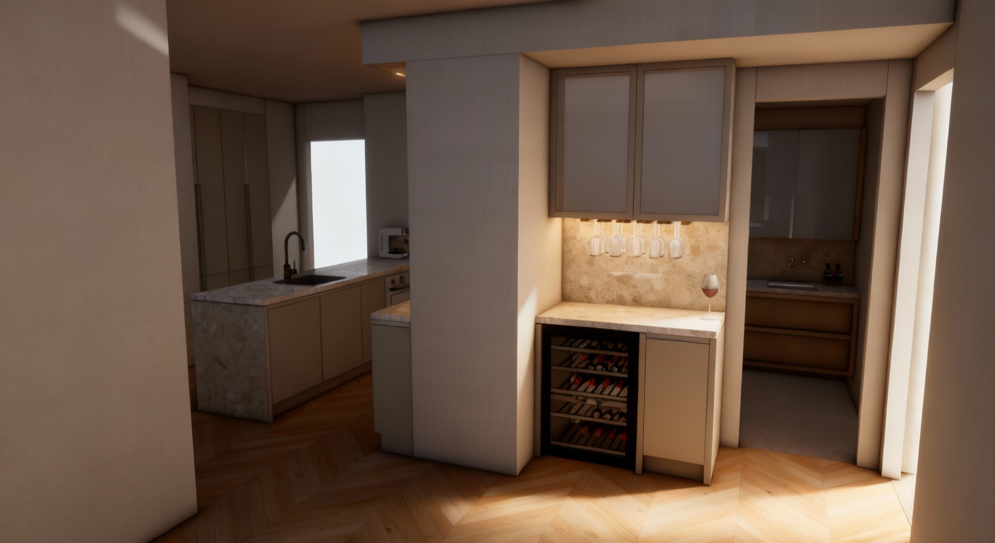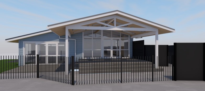 urban outdoor space with pot plants on deck show black brackets on exposed truss