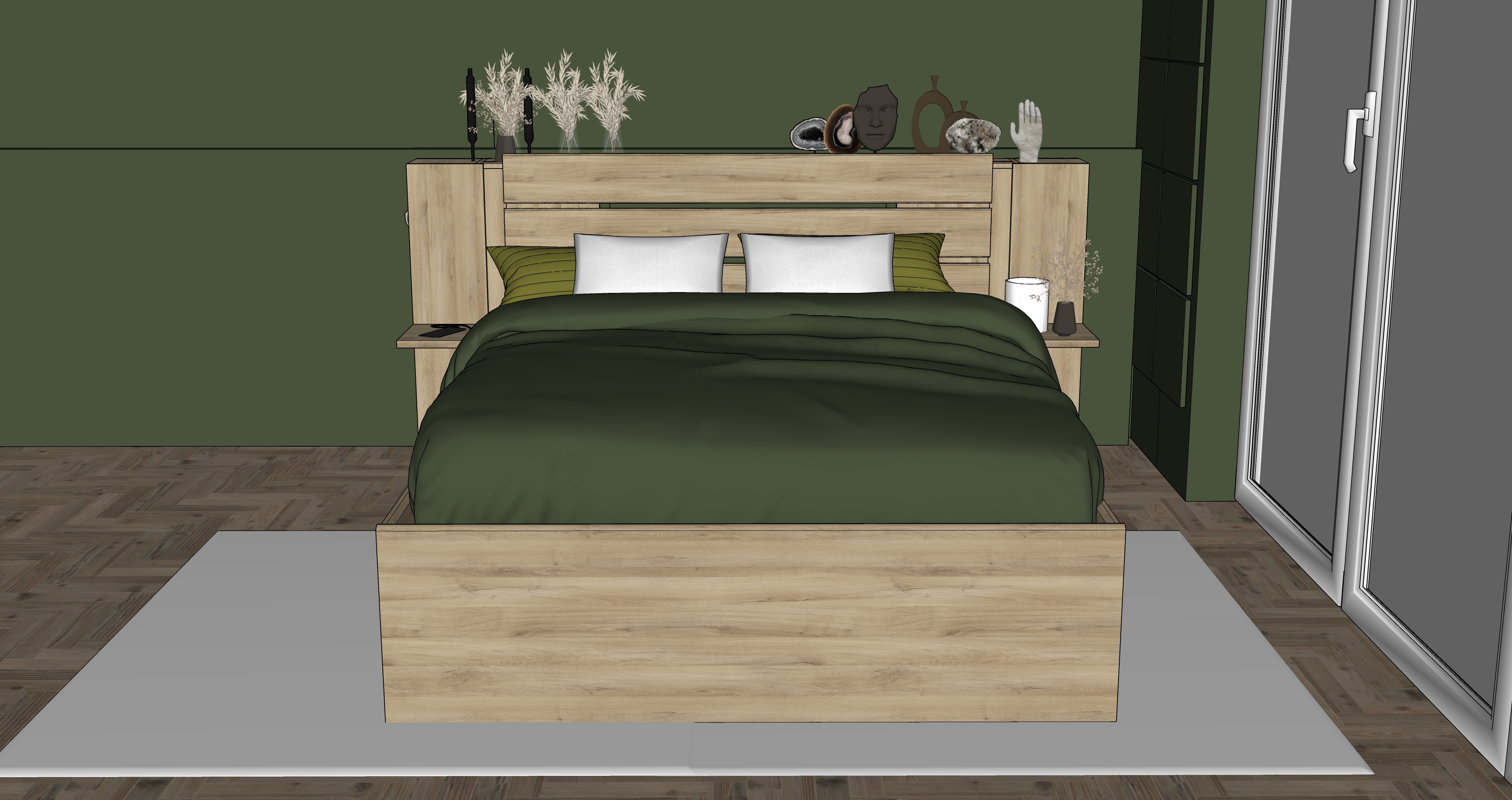 chambre moderne et chaleureuse au design naturel grand lit avec drap beige couvertures vert fonc et coussins assortis mur d coratif vert textur plantes tombantes fix es en hauteur suspensions avec ampoules vintage en verre sol en bois clair grand tapis gris chaussures dans les niches basses du lit ambiance cosy style contemporain et minimaliste rendu photor aliste haute r solution pas d clairage de niche