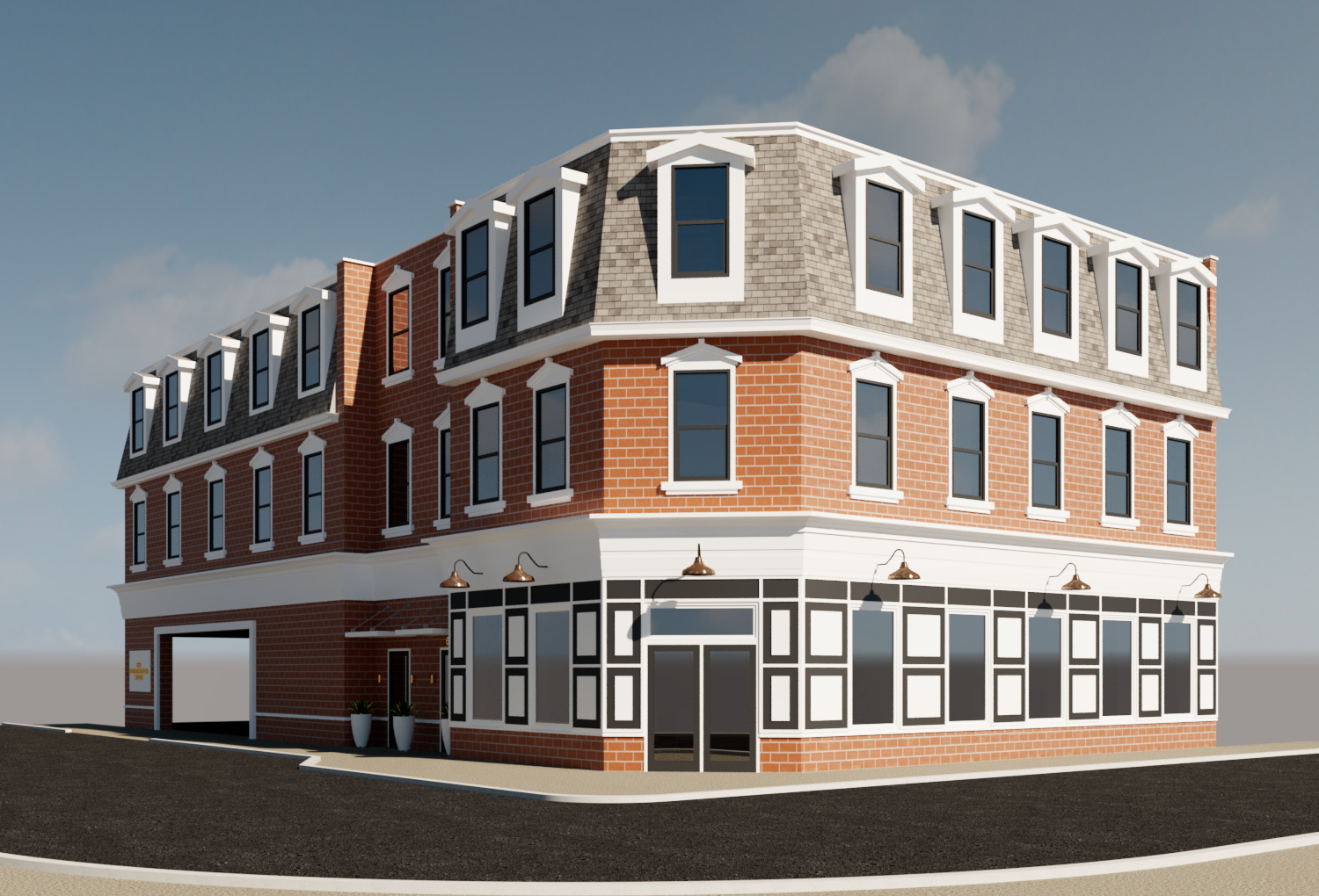 photorealistic noon clear skies beautiful day in new jersey located on the corner of a side street trees in front of two family homes built out of vinyl siding on the sides of the main building
