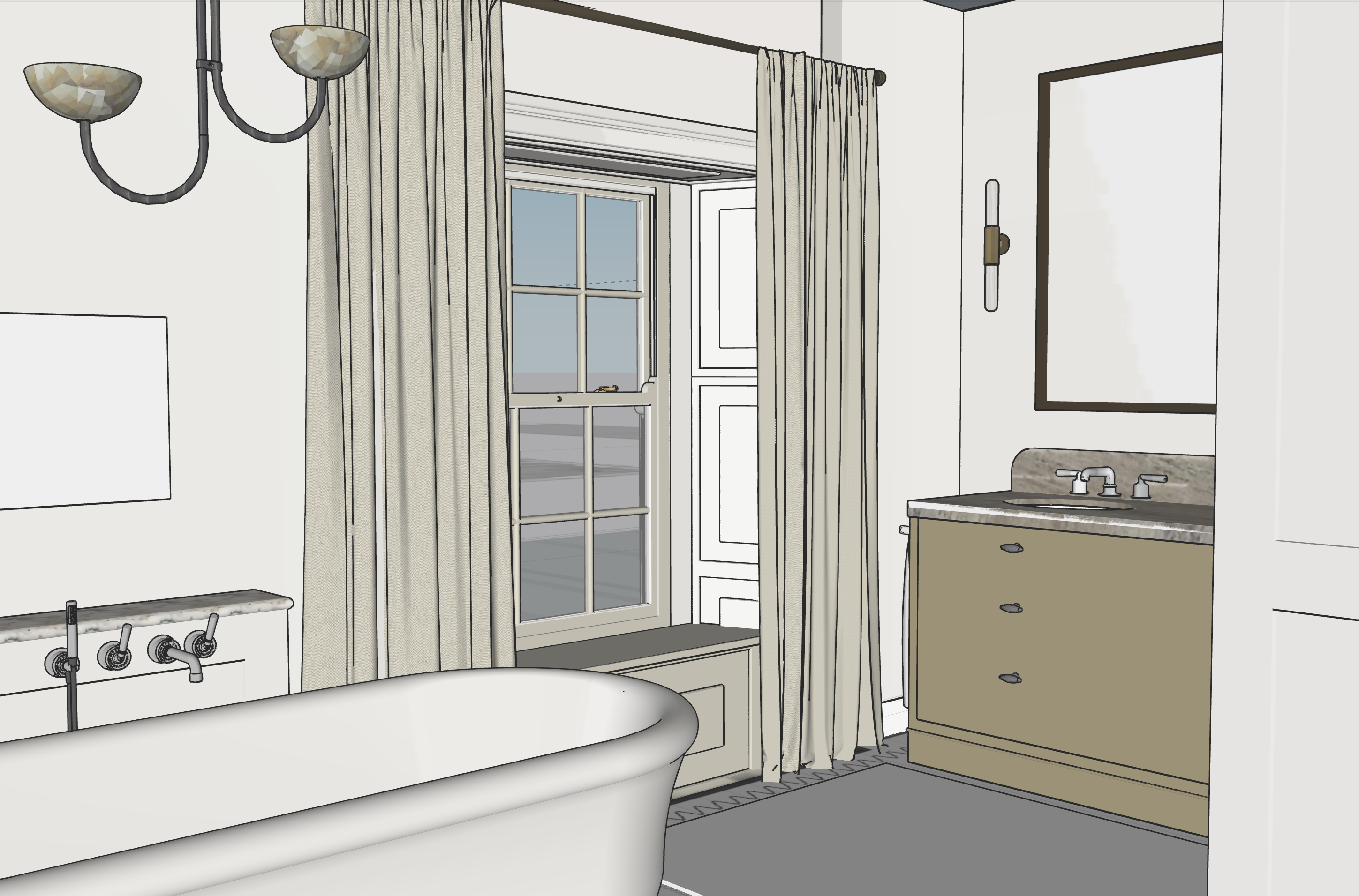off white limewash paint texture on walls vanity is painted and drawers show handles exactly as model show wall lights exactly as model