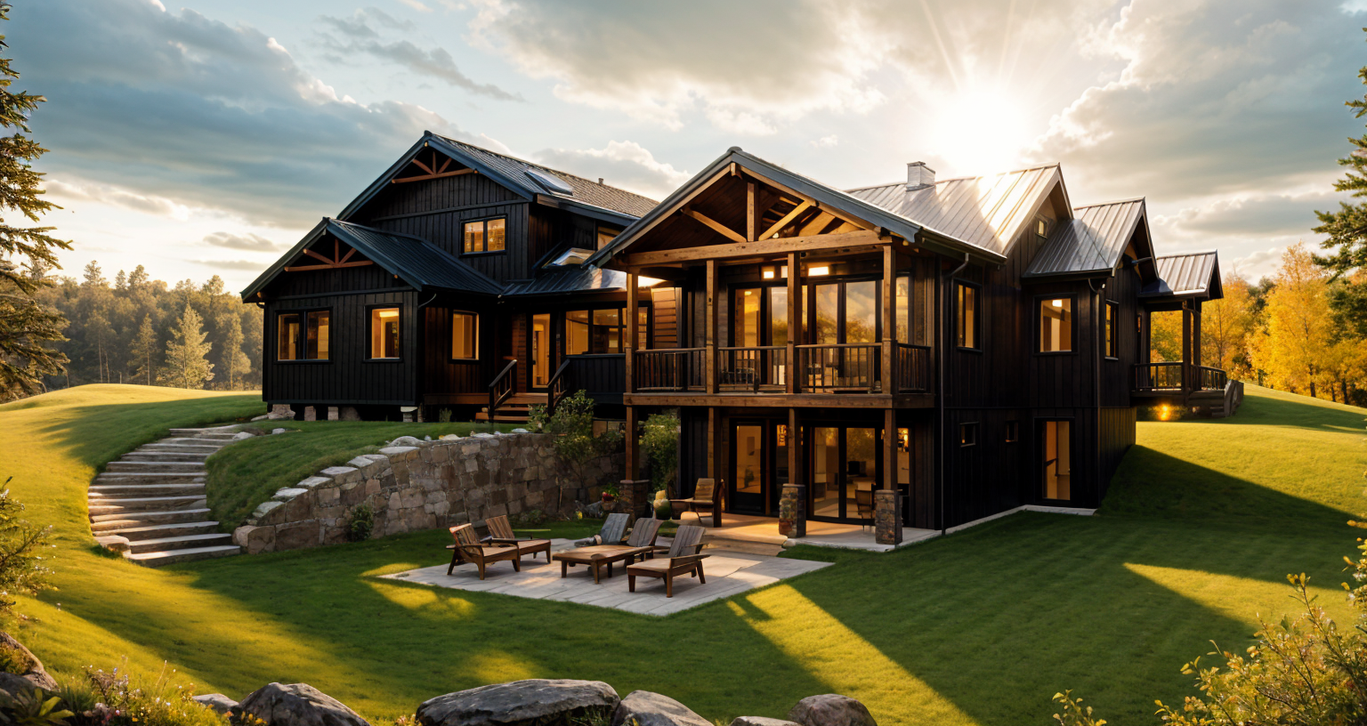forest quebec sunny morning close to noon black metal roof black windows black doors dark exterior finishes 4k