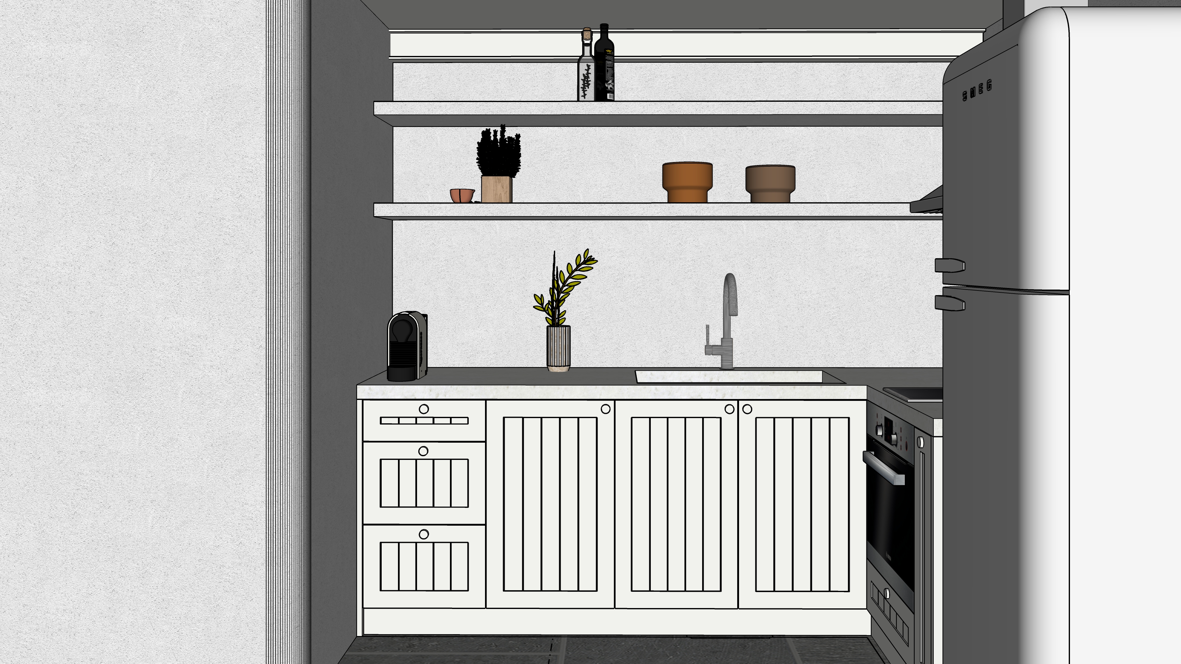 main prompt this is a cycladic house in kythnos the floor is natural gray pelion stone the kitchen cabinets are white there is natural light negative prompt do not change geometry do not add objects do no change colors or materials