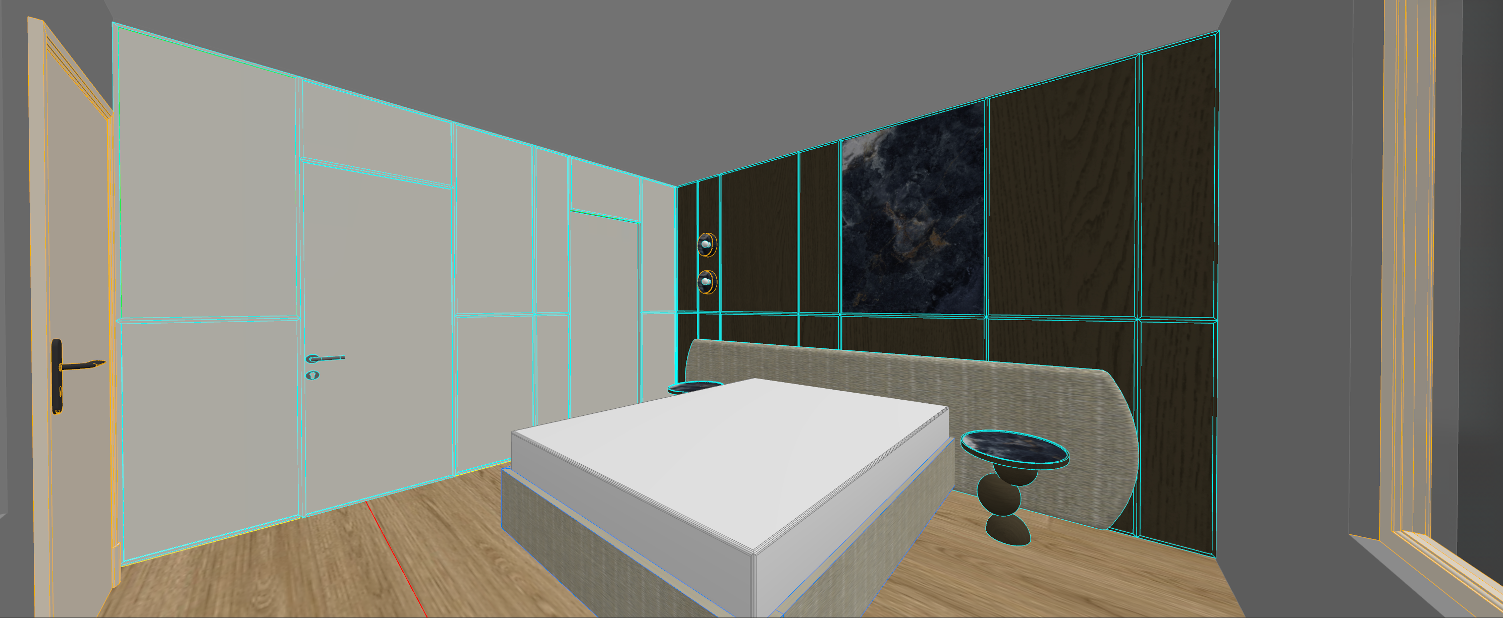 the left paneling should be white the wall paneling behind the bed should be a light wood tone add a bedspread and pillows keep the lights dim you can add some decoration to the room keep the oval headboard behind the bed intact