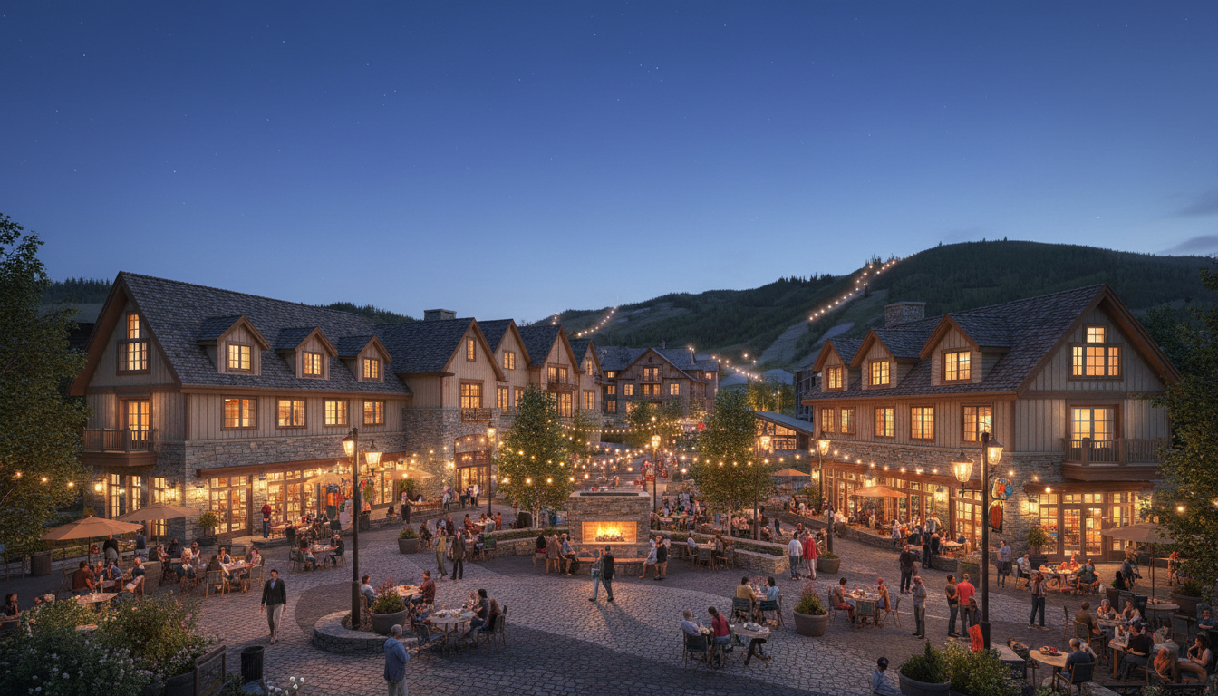 a downsized base area development at park city mountain resort focus on integrating the design into the historic character of the old town historic district while also making a great public experience ensure the rise in topography is maintained from the foregroudn to background but make the buildings shorter via spreading the density to make better for pedestrian scale