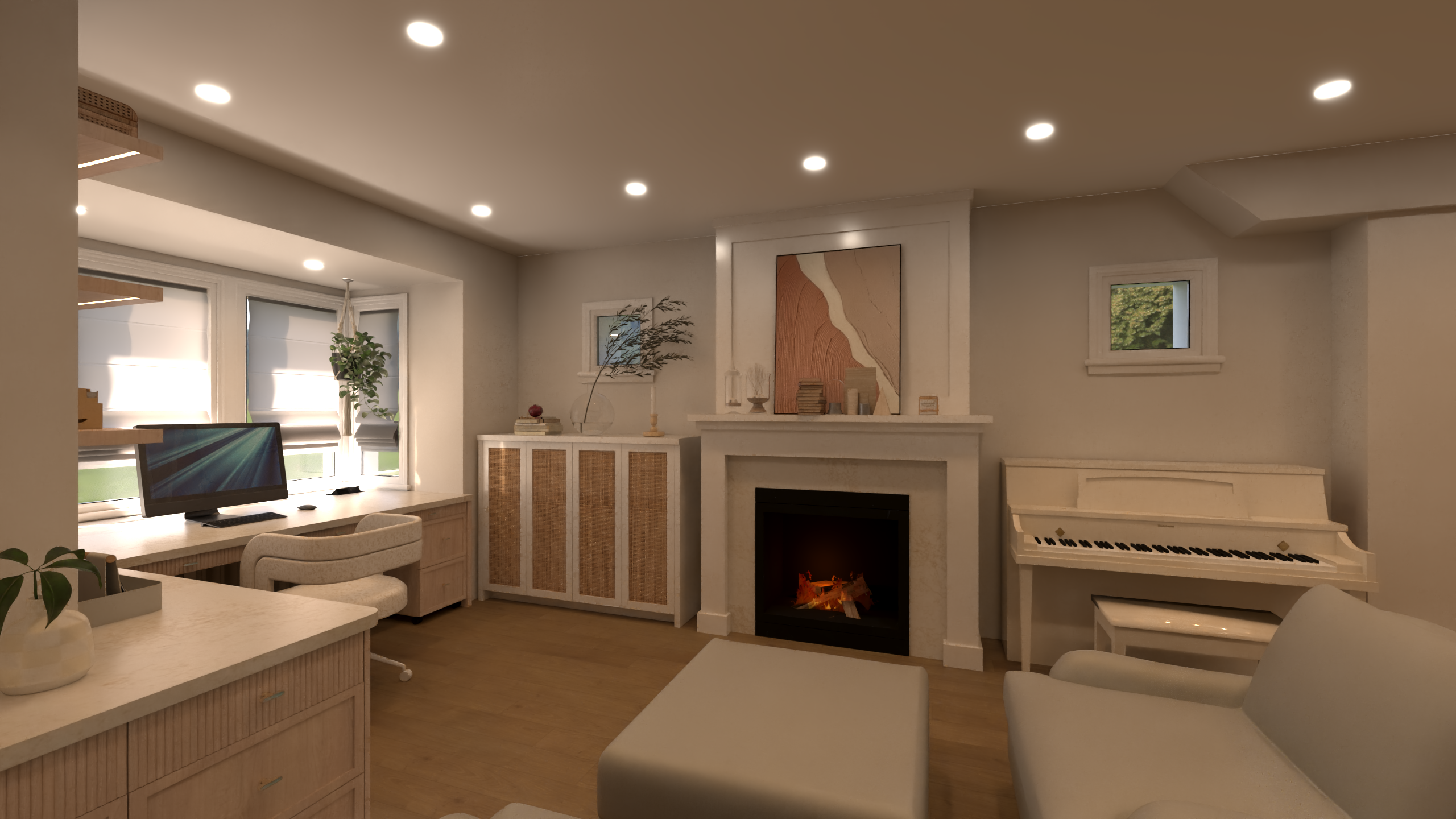 do not change model a cozy modern living room with a warm and inviting atmosphere the walls are a soft off white and the ceiling features recessed lighting with a gentle glow a large abstract painting with earthy tones embellishes the mantle above a white fireplace flickering with a vibrant orange and yellow flame on the right side a classic ivory piano adds elegance the hardwood floor is a rich oak brown while the furniture including a cushioned chair and ottoman is upholstered in a soothing sage green velvet a lush green plant in a white pot hangs by the window enhancing the natural light filtering through accentuate this serene environment with touches of warm wood and soft textiles countertop for the desk area is white with very subtle gold vein