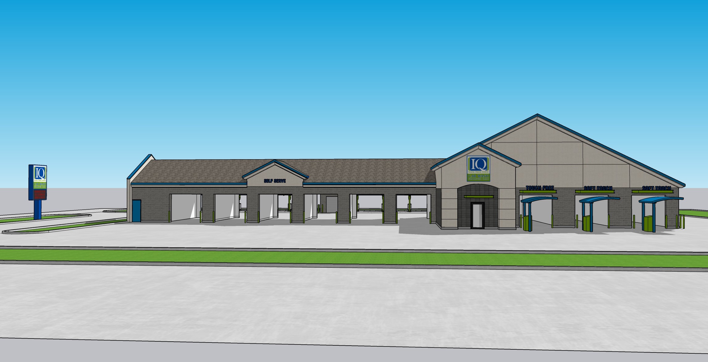 modern architecture style in bay car wash in enid oklahoma the building exterior is splitface cmu wall with charcoal color smooth cmu band 3 the gable roof ends have eifs finsh along with the front of the office area and a charcoal color composition shingle roof the site paving is concrete and the site has landscaping