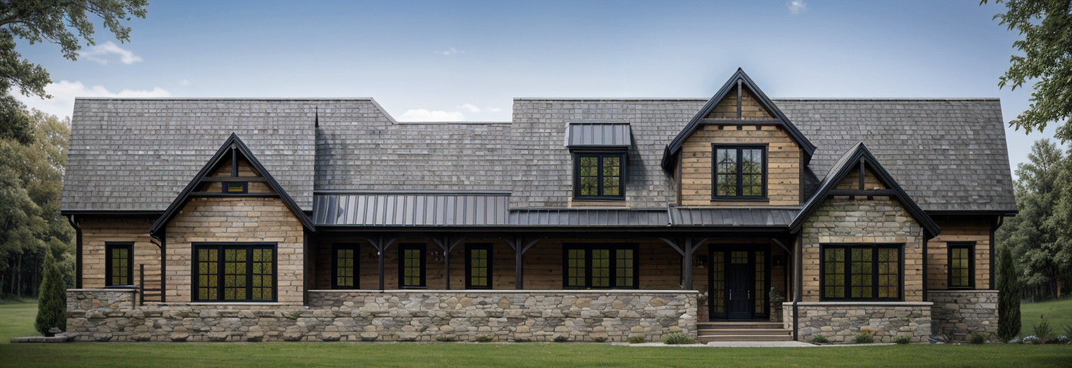 exterior shot render a modern two story house with a sleek design use a soft cream color for the walls complemented by a dark charcoal roof the windows should have black frames for contrast add a wooden door with a warm rich oak finish surround the house with lush green landscaping featuring colorful flowers like lavender and marigolds the atmosphere should be bright and sunny with a clear blue sky and soft natural lighting to enhance the warmth and inviting feel of the home
