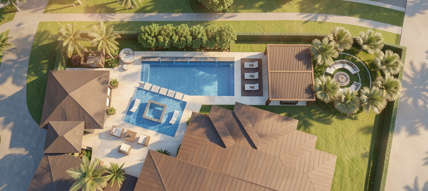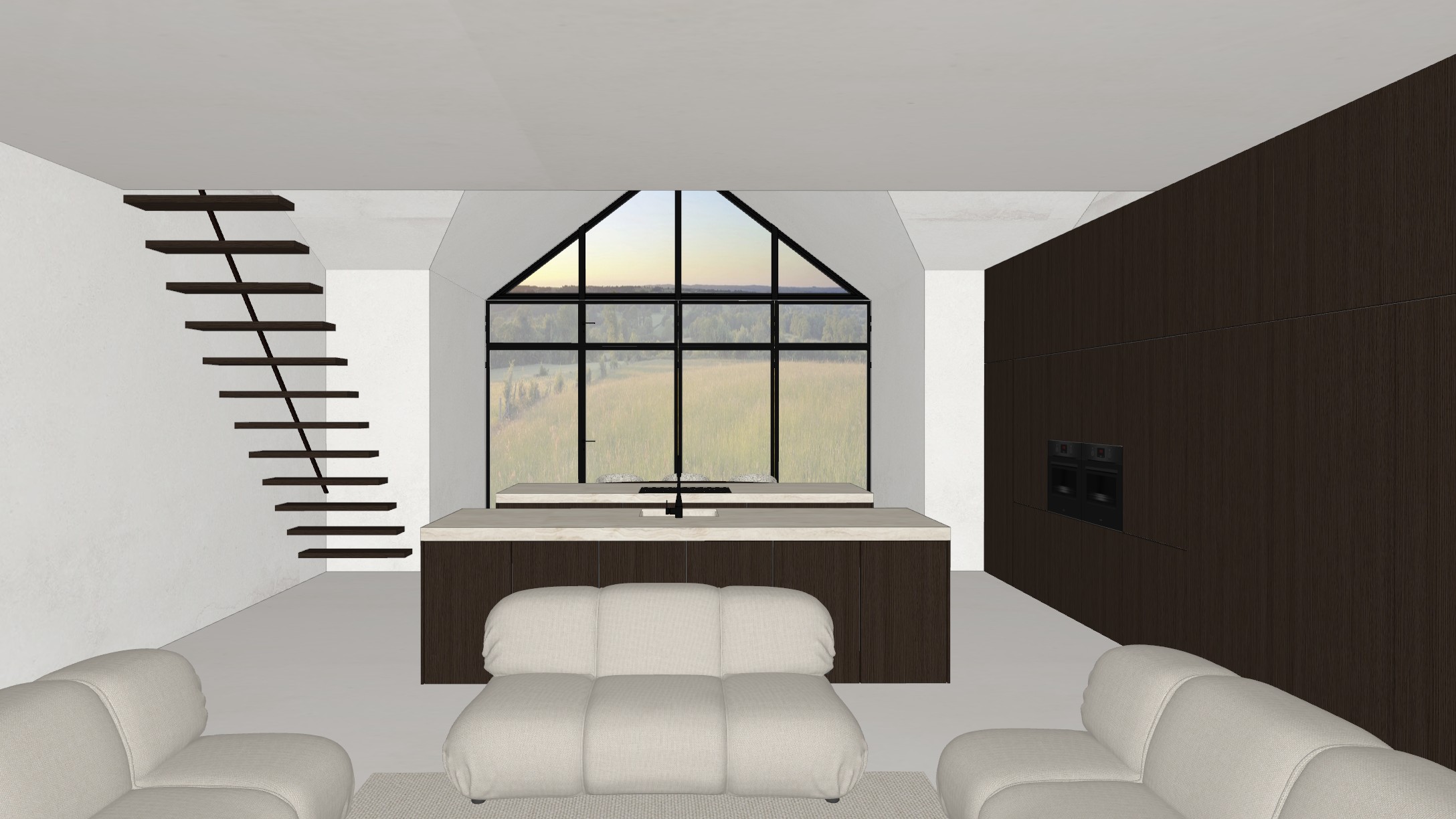 beautiful luxury dark veneered kitchen with a thick travertine worktop the floor is a light warm cement and the general vibe is japandi