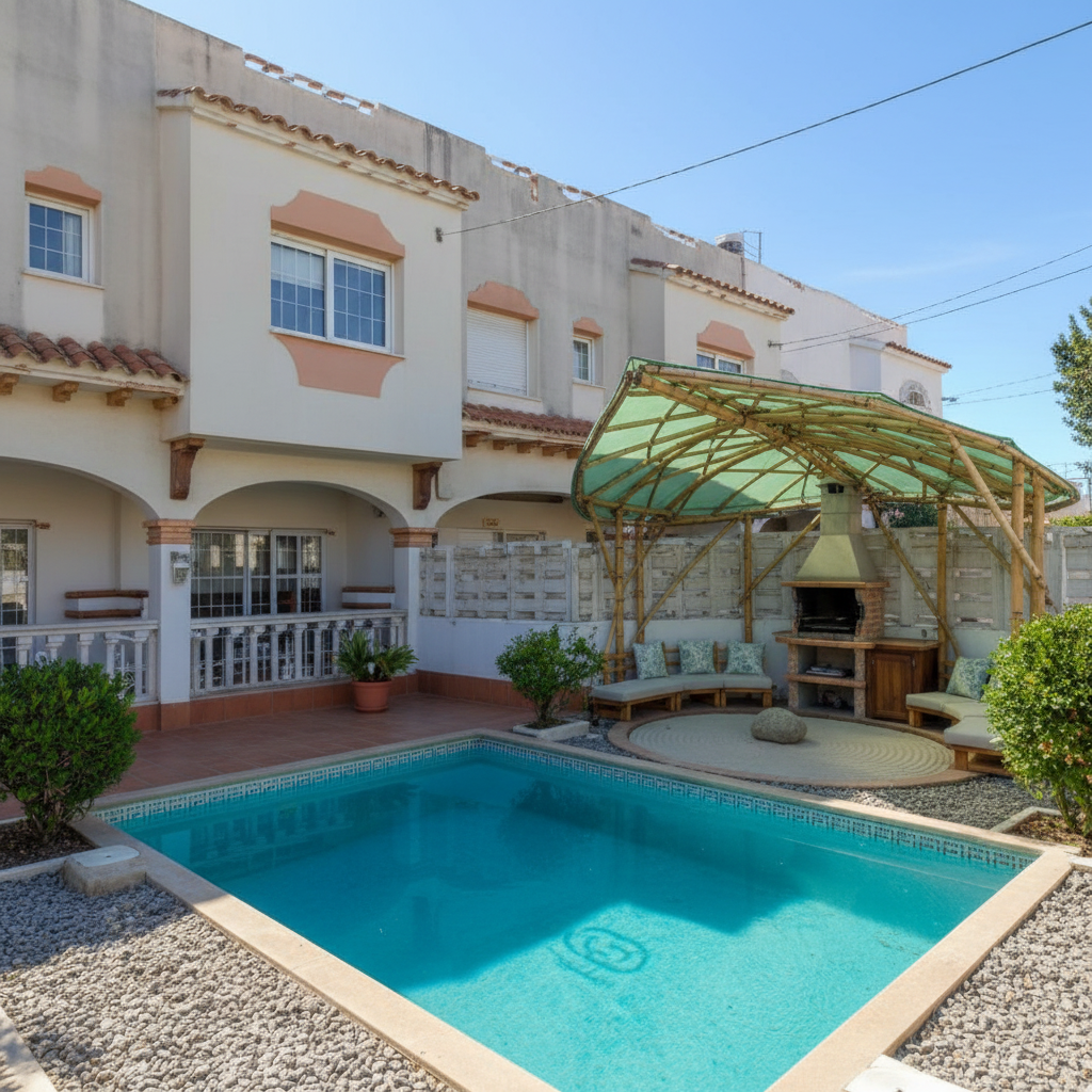 fire area with a large fire wooden beams around the fire are dark stairs to the house are wooden beams with gravel filling between them lots of green plants around the terrace lower terrace is dark with a net in the middle with terrace beds and a hot water tank path to a wooden swing made of soil swing has a flowerbed on a beam swing cables are made of chain terrace of the house is covered with a roof made of shingles terrace fence of the house is made of dark green wood stairs to the terrace are dark wood the surrounding area has lots of bushes tall grass christmas trees and bushes of different types retaining walls material is corten metal render in hyper realistic architectural visualization quality 8k resolution