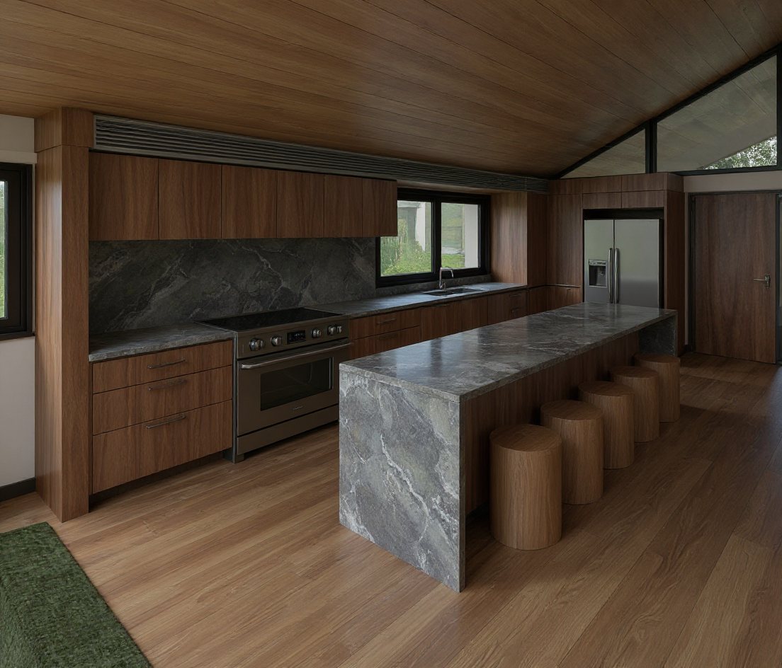 render a luxurious two story house in a modern architectural design the exterior walls are finished with a light gray siding and the roof is a sleek dark slate gray windows are large and clear reflecting the surrounding environment with white trimming the stonework on the right side is in shades of natural beige and earthy tones the railing of the balcony is a soft silver complementing the overall palette the setting is a serene late afternoon with a golden sun tint casting warm and inviting shadows creating an atmosphere of comfort and elegance
