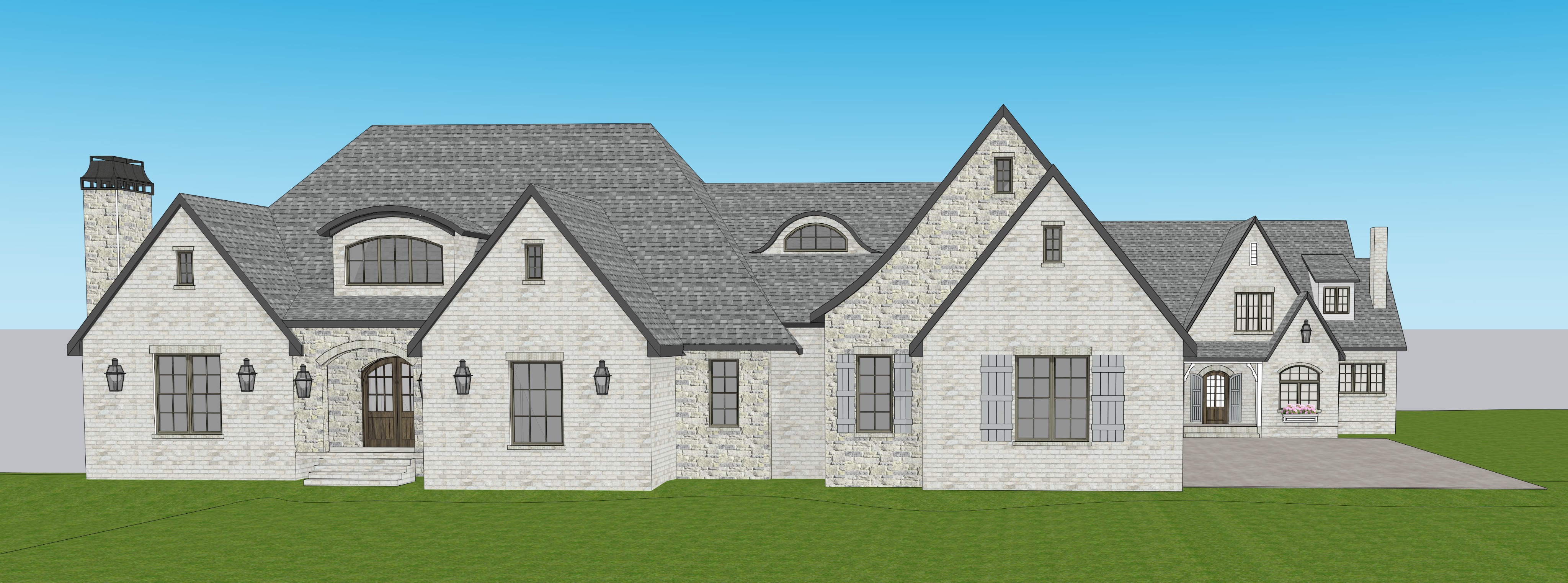 add 10 trees to the background add landscape in front remove the flower boxes make walls lighter