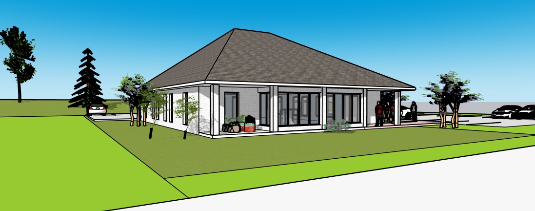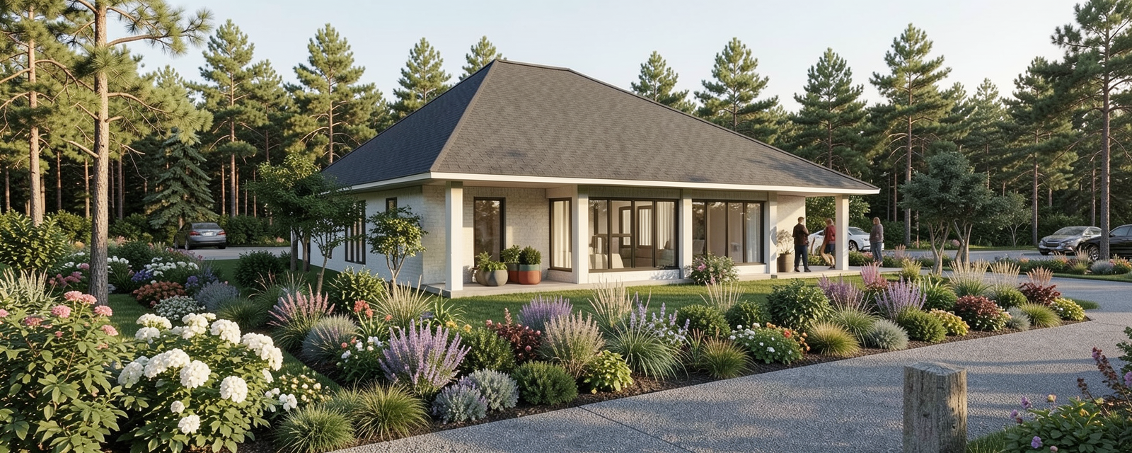 add limited landscaping with some color near the building in front and sides and pine trees in back