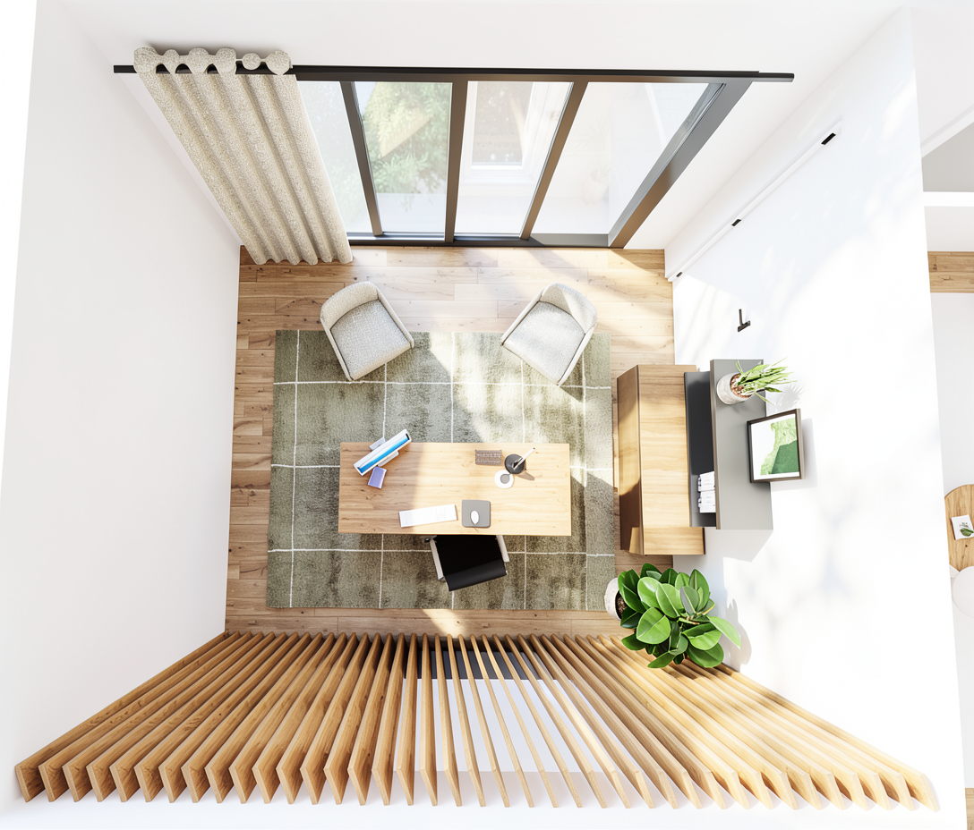 add stainless appliances change island a brown maple texture with little woodgrain add the same woodgrain to the bottom of the rangehood add counter decoration make the rangehood top white create a woodgrain band around the bottom of the rangehood change the barstool frames to brass and the pads to brown leather add a grey tone to the floor keep the perimeter cabinets at white change the dishwasher to stainless steel add a trim around the bottom of the island add counter decoration change the pot filler to brass