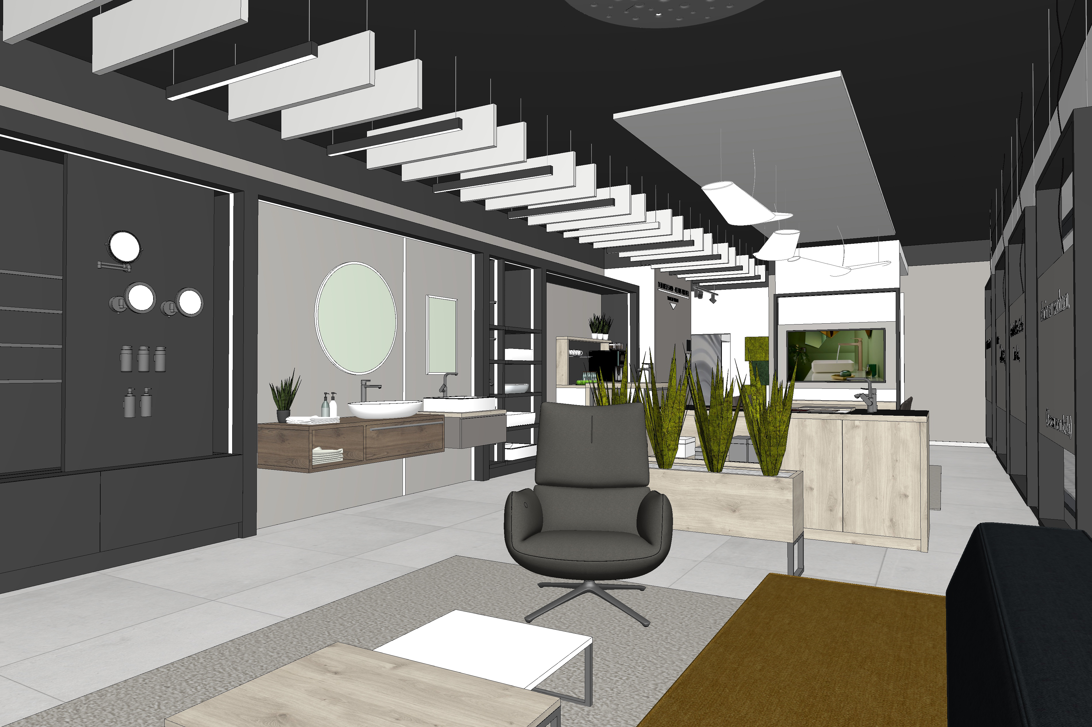 use the provided cad perspective strictly as the sole geometric and compositional reference preserve all elements exactly as given including proportions layout camera position field of view and object placement do not add remove reinterpret or redesign any architectural or interior elements no new objects furniture or light sources may be introduced under any circumstances all visible text within the image must be preserved exactly as shown do not alter reinterpret stylize translate or replace any text typography spelling layout and positioning must remain 100 identical to the original enhance the image exclusively through photorealistic rendering quality apply realistic materiality to all surfaces based on their implied function and construction maintaining the original design intent surfaces should exhibit subtle physical properties such as texture depth light absorption soft reflections and where appropriate controlled specular highlights or mirror effects avoid exaggerated or stylized materials aim for believable natural realism lighting introduce natural daylight entering the space in a plausible and context appropriate way the daylight should appear realistic and balanced without being limited to overcast conditions detect and utilize all light fixtures that are present in the original cad image these must visibly emit light and contribute to the overall illumination of the scene artificial lighting should produce realistic light falloff gentle highlights and nuanced shadow transitions do not add or invent any additional light sources beyond those already visible in the image the final image should read as a faithful photorealistic translation of the original cad perspective not as a reinterpretation