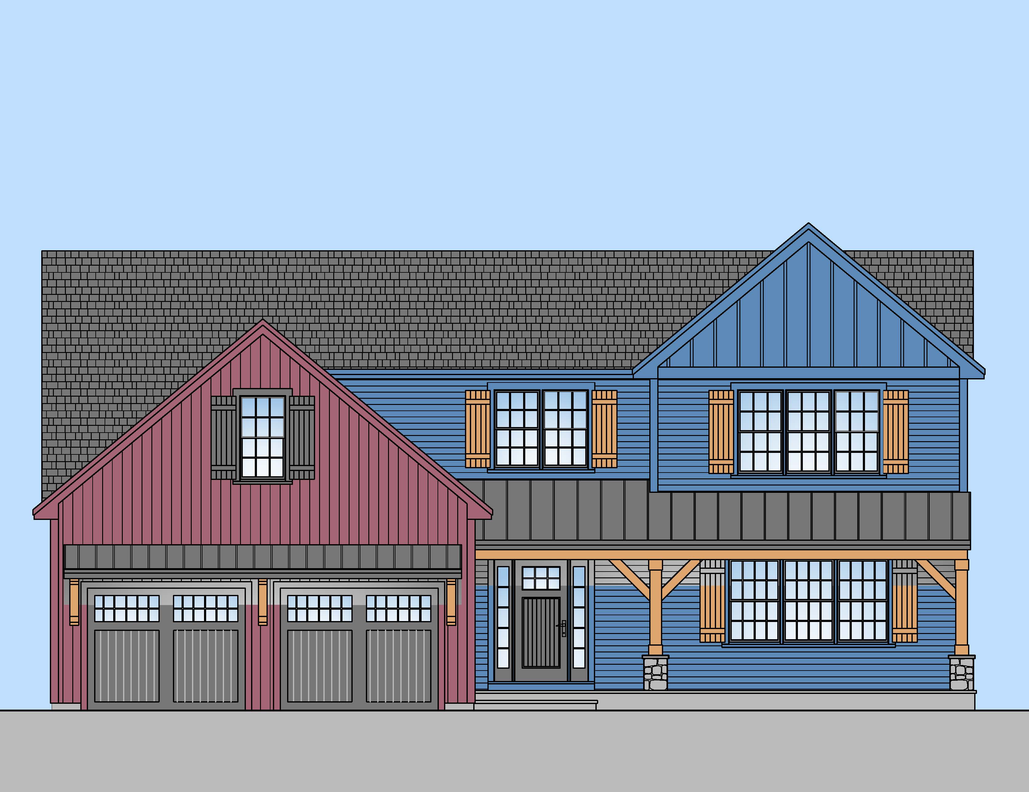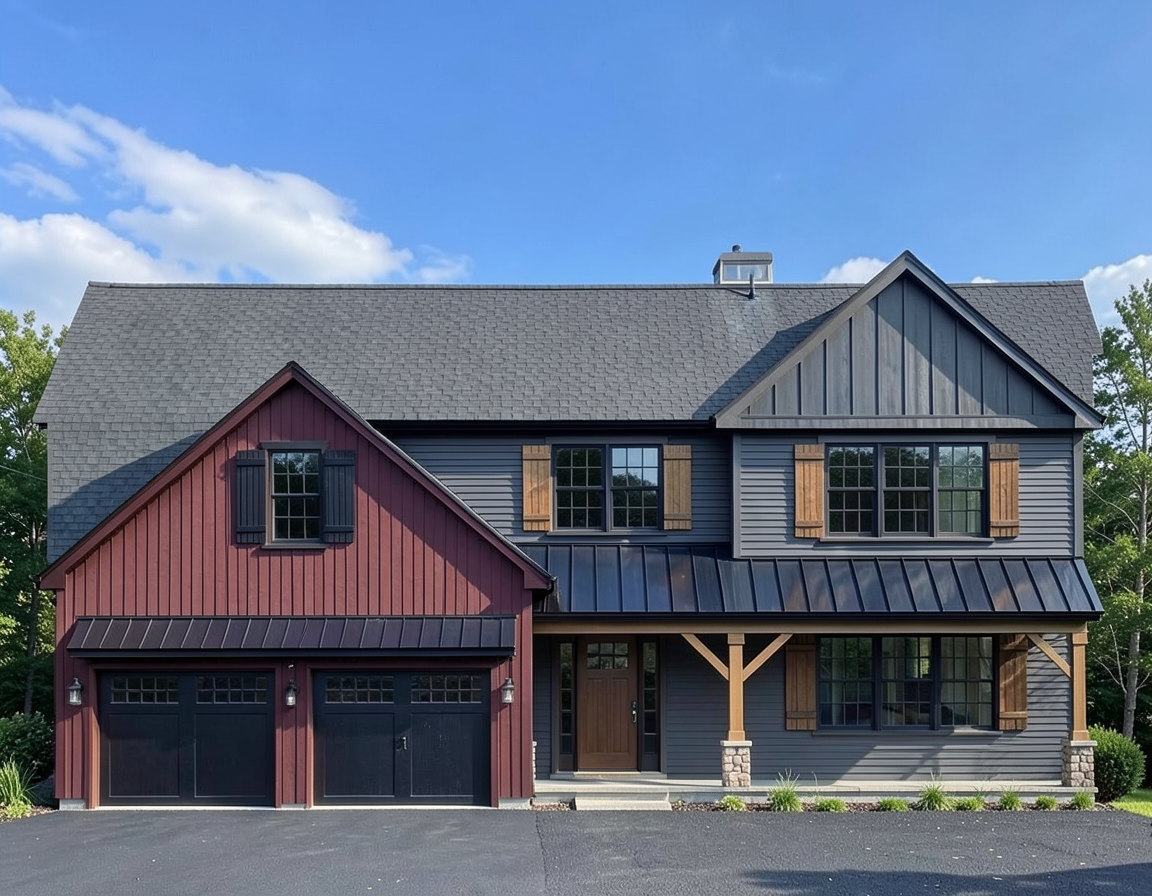 blue sky black doors darker red siding on garage only dark grey siding on main house walkway to front door asphalt driveway in front of garage only black metal roof at covered porch asphalt shingle roof on top natural wood shutters and columns on main house natural wood shutter on window under covered porch fieldstone base at columns black shutters on garage window black windows black front door natural wood brackets on garage