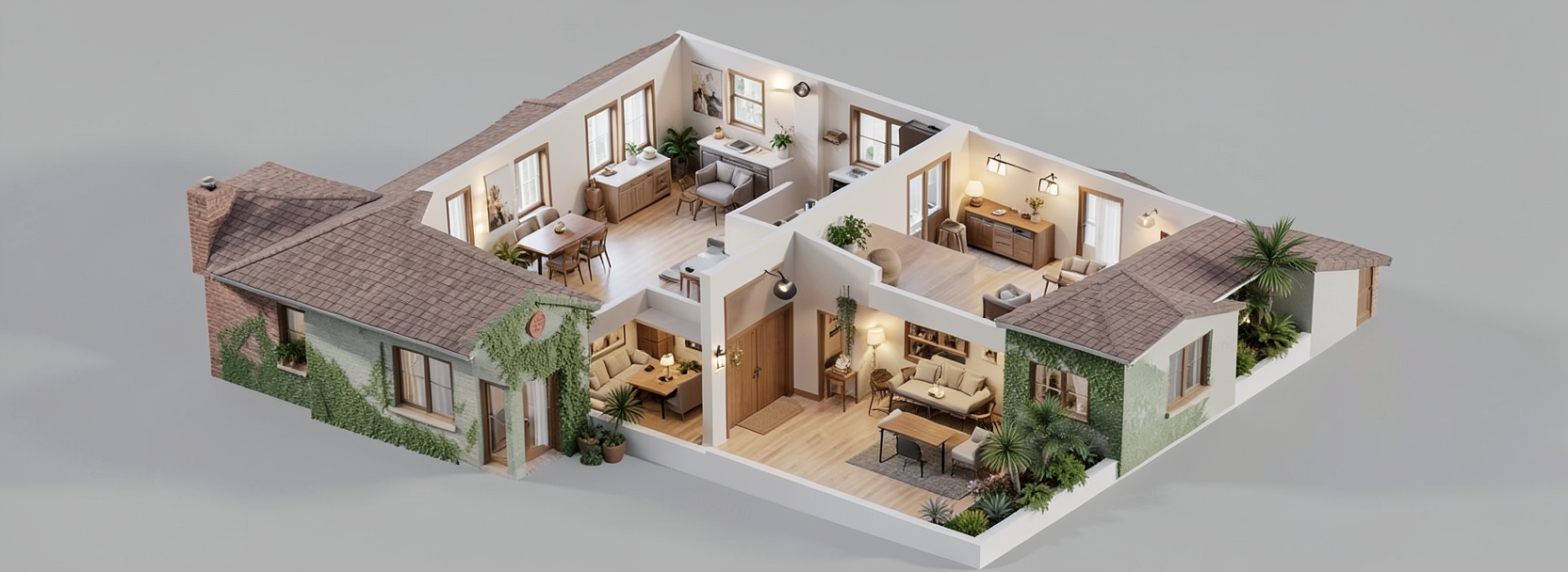 convert this floor plan into a realistic isometric 3d view of a full house