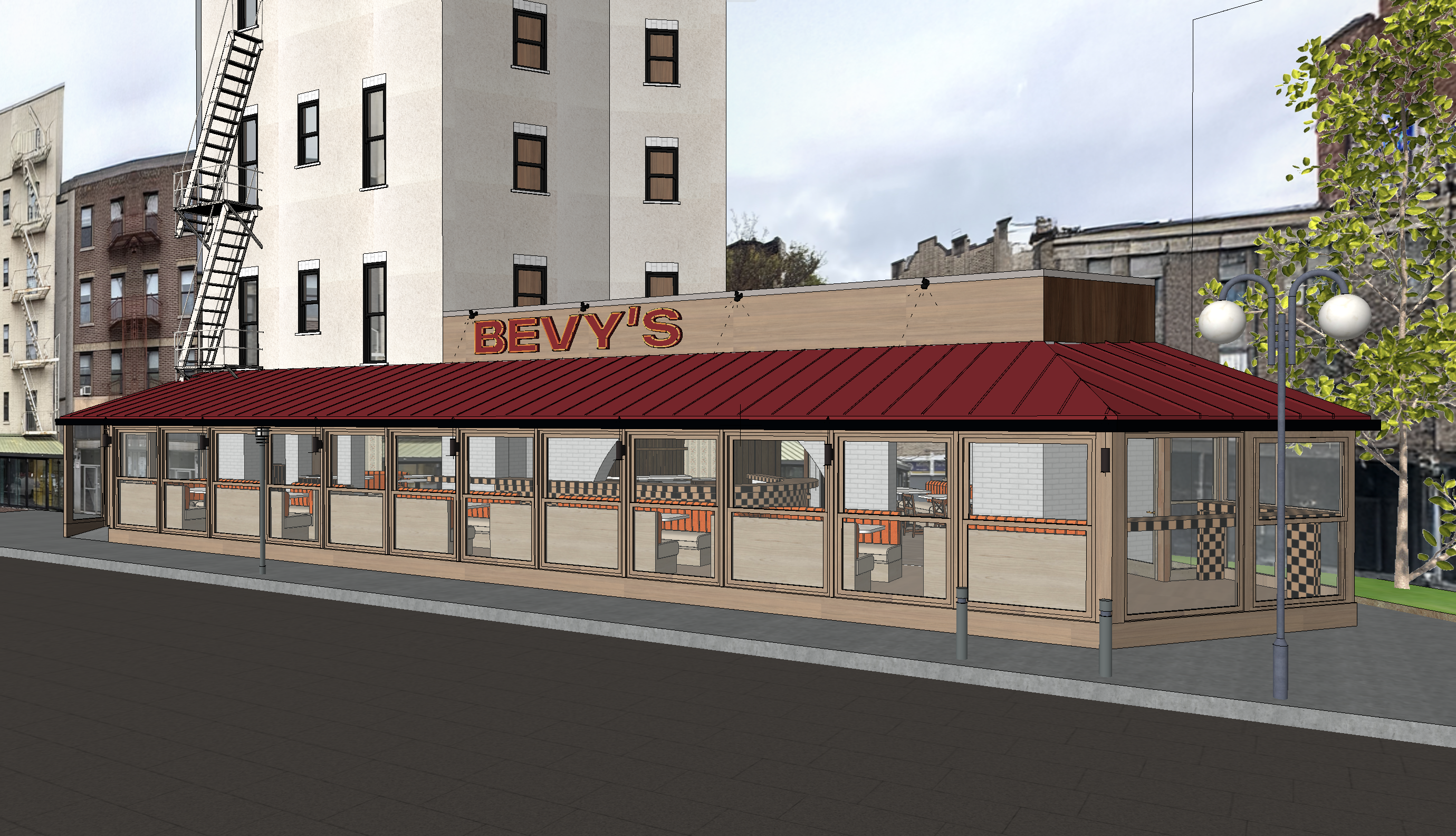 photorealistic summer daytime exterior of the bevy s caf in new york with a long glass enclosed terrace framed in light oak wood light oak parapet and light oak upper fa ade sign panel deep burgundy standing seam roof in bright sunlight strong daylight reflections on the glazing warm visible interior with orange velvet banquettes black fa ade spotlights above the bevy s burgundy sign with subtle orange neon outline clean sidewalks green summer trees and a vibrant sunlit new york streetscape with brick buildings and crisp shadows