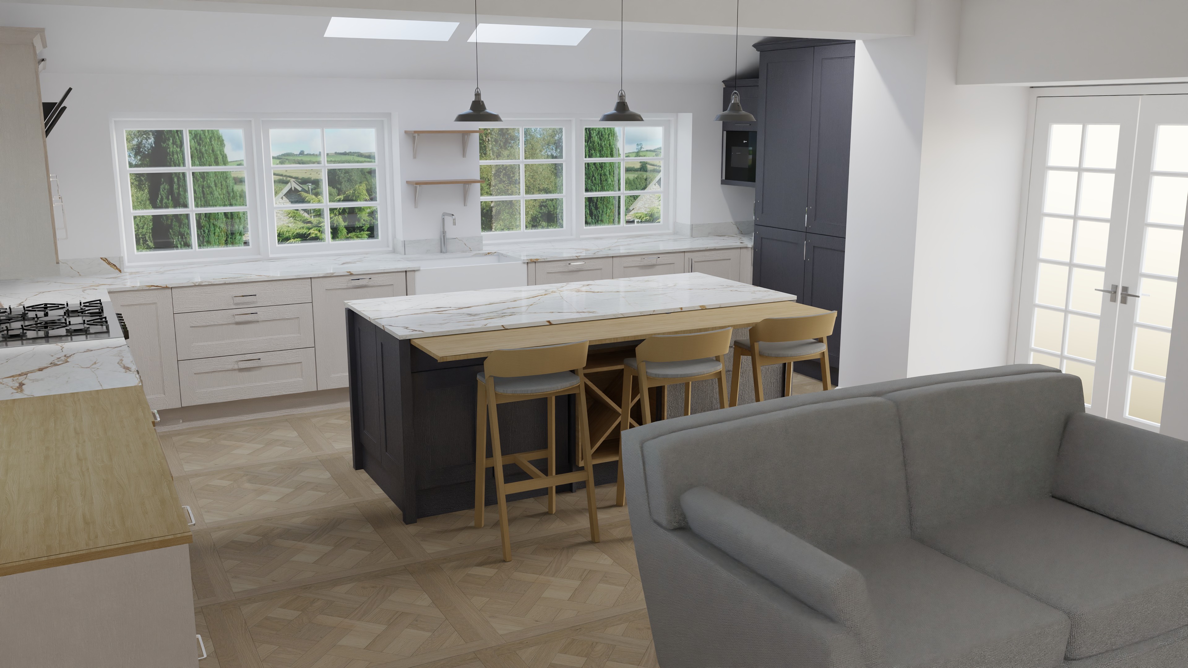 realistic photo 8k lights under cooker hood peace lily on the island dress the kitchen ceiling spotlights cushions on the sofa natural sunlight