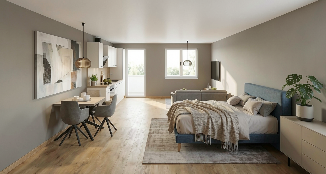 a cottage with rustic charm extension featuring red clay roof tiles and warm gray brick walls the large windows framed in black allow natural light to flood into the cozy interior surrounding greenery includes lush trees and vibrant bushes reflecting a serene countryside atmosphere the sky is a vivid blue creating a tranquil and inviting environment the overall mood is peaceful and inviting capturing the perfect blend of nature and architecture