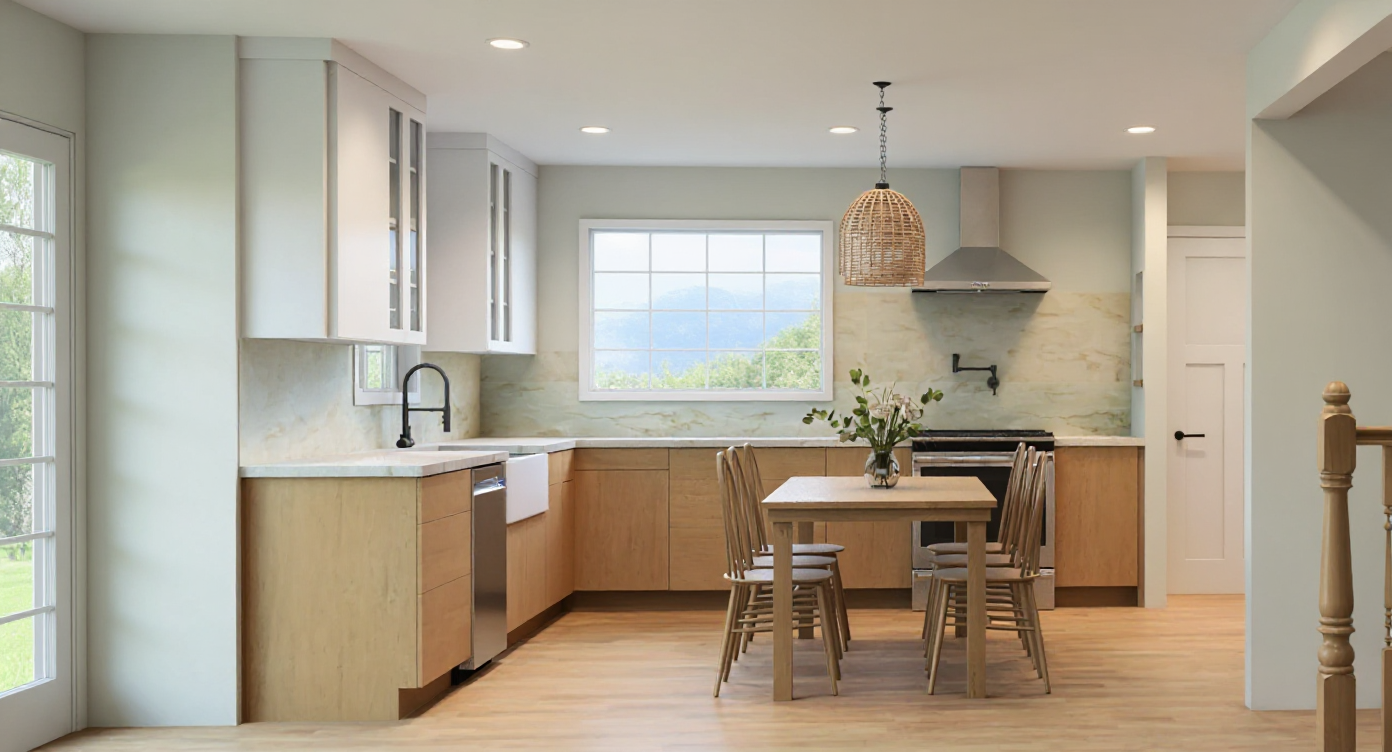 add recessed lights to the ceiling change the view from the window to more green nature and the glass to be cleaner change the shade of the backsplash to a lighter one the walls are white