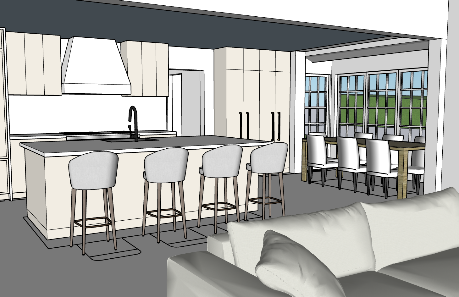 make a photorealistic rendering of the interior of a kitchen with traditional touches but modern clean lines show sunlight coming through the windows make the countertops white marble and the backsplash white marble
