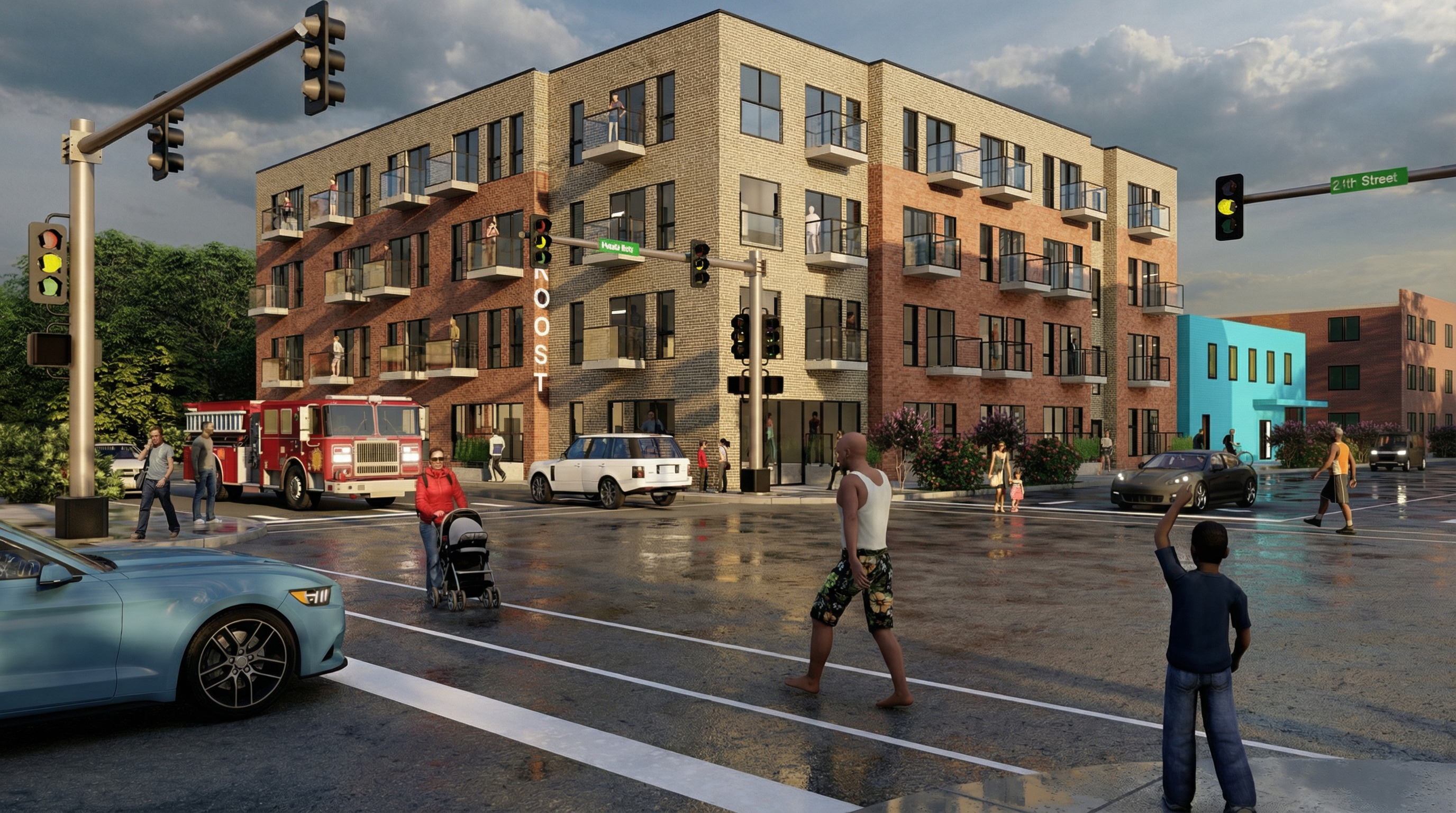 this is the walkout backyard of a home in a housing development in winnipeg manitoba there will be houses across the street in the background and on either side of the building about 10 feet away form the building some tasteful restrained landscaping with low flowers and shrubs and bushes add some outdoor furniture to the covered deck