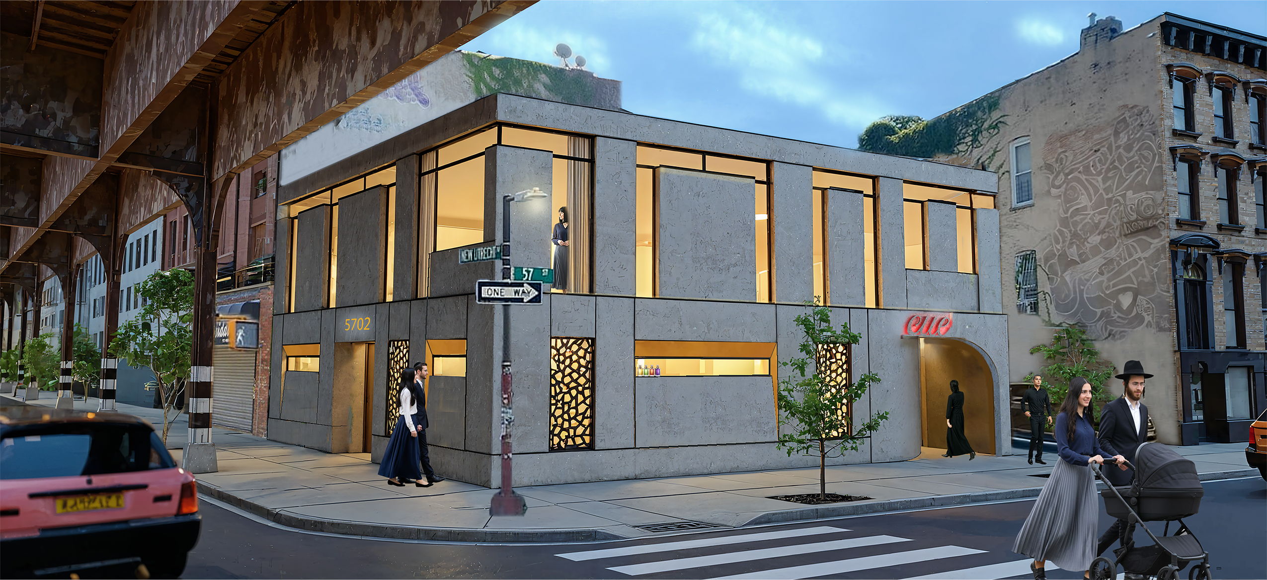 contemporary two story fa ade with smooth concrete panels in a pronounced grain texture bronze metal accents and elegant bronze lattice details large glass windows reveal a warm well lit interior urban brooklyn street under an elevated train line cinematic dusk atmosphere around 4 pm not too dark ultra photorealistic architectural render birds flying in the sky