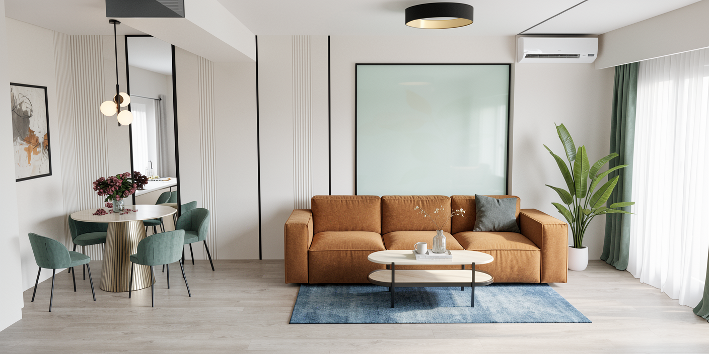 render fotorealistic make sure lights are emissive natural daylight soft sunlight realistic materials real floor parquet oak bar chairs same wood as dining chairs tray on table in wood table in mortex same color as the walls and ceiling glass door with bronze frame