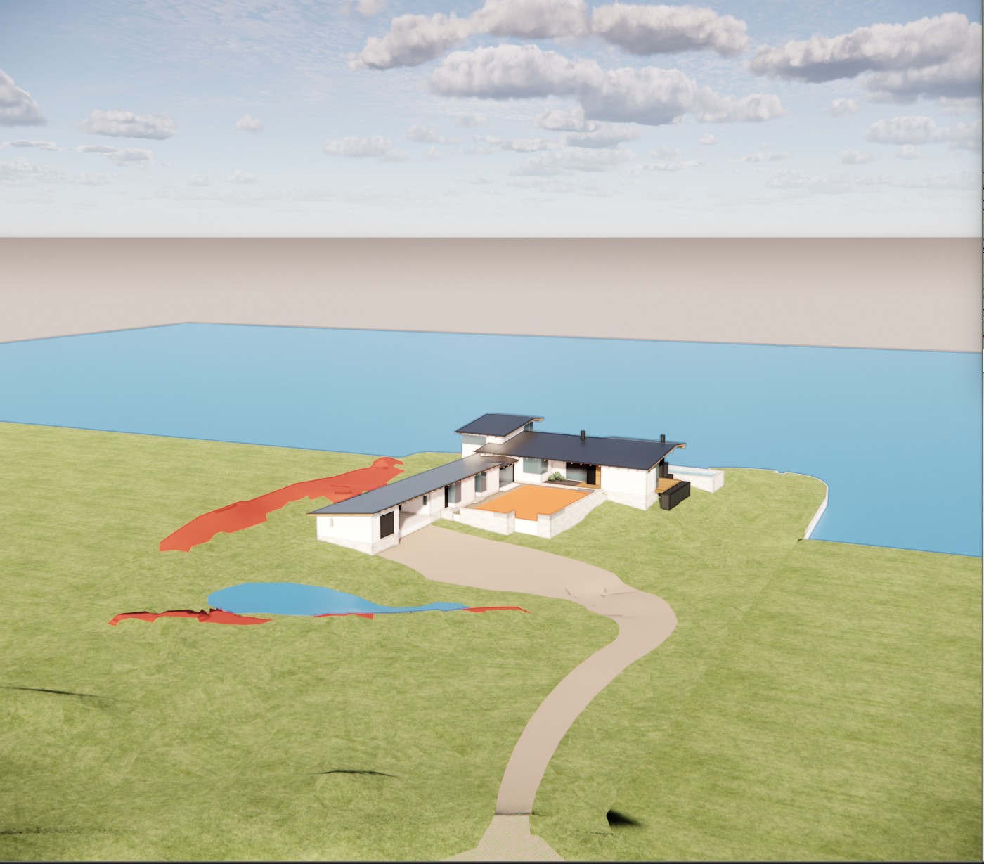 aerial architectural rendering of a contemporary lakehouse residence on inks lake texas late summer afternoon light north facing view looking out across the lake calm blue green water at normal level with gentle wind ripples shoreline reads as natural and clean with subtle earthen banks and native grasses no dramatic limestone shelves or exposed ledges rolling hill country terrain with scattered live oaks and ashe juniper dry golden grasses with some green pockets prickly pear red is limestone boulder outcropping accents warm atmospheric haze over distant low hills the lakehouse sits lightly on the site with a refined modern material palette white stucco siding light gray standing seam metal roofing exposed timber rafter tails orange is a lwan retain the exact structure window arrangement rooflines foundation height and proportions exactly as shown in the reference image minimal site disturbance native drought tolerant landscaping natural pathways and a minimal gravel front driveway extending toward the house integrated naturally into the terrain with discreet parking photoreal architectural visualization ultra realistic lighting crisp shadows crisp building edges high detail vegetation and ground textures glass reflections and a vibrant clear sky with light atmospheric depth render in hyper realistic architectural visualization quality 8k resolution