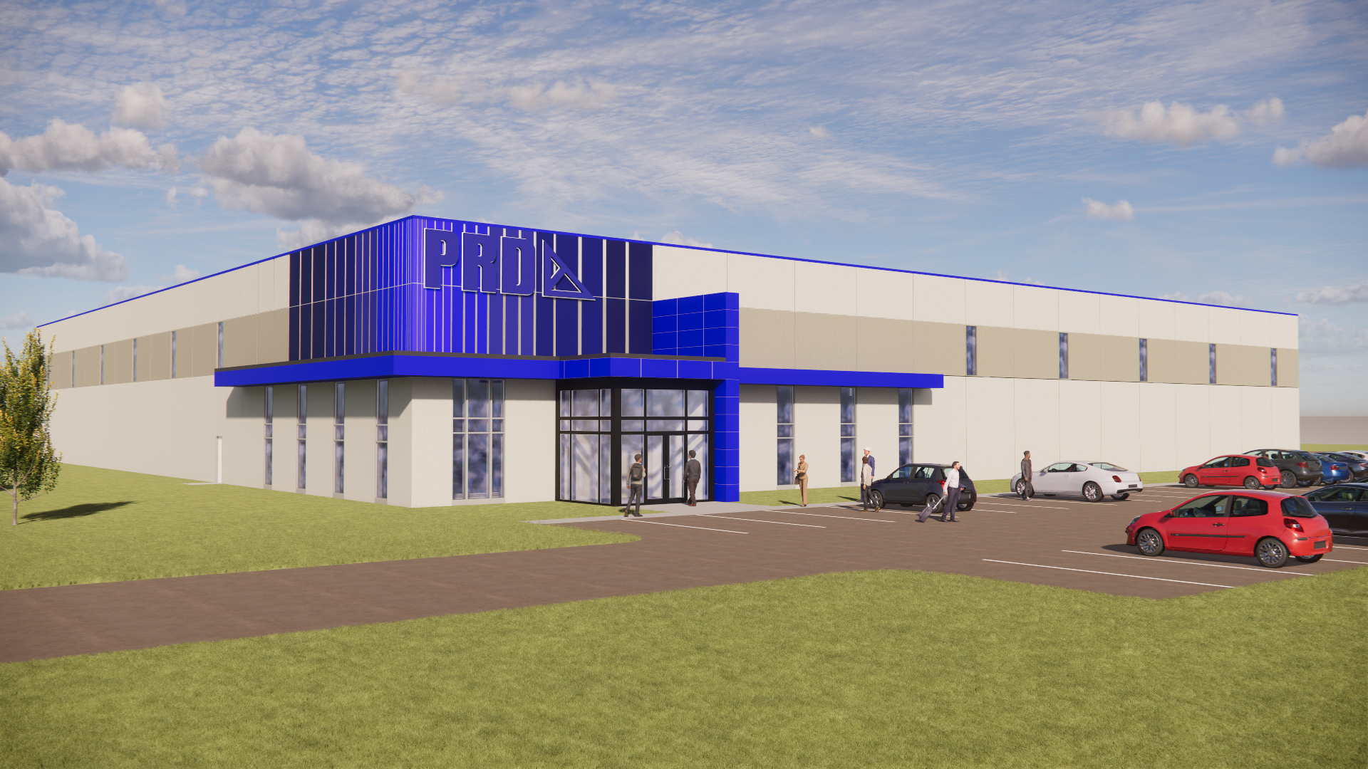 precast commercial building with a full glass vestibule as shown asphalt parking lot and some small trees in the far background