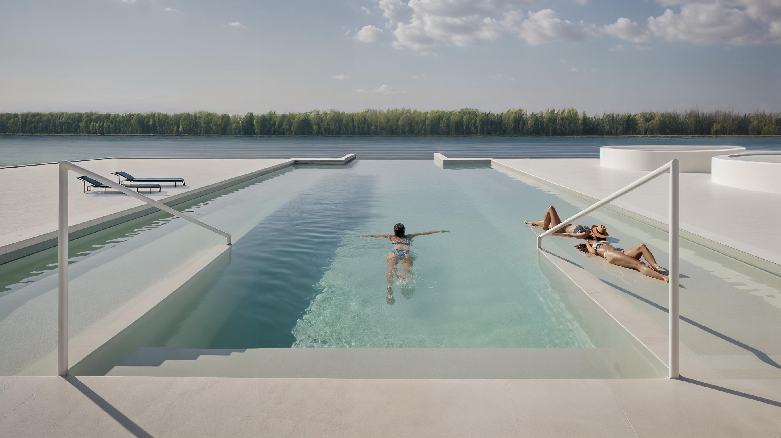 transform this image into a hyper photorealistic architectural visualization no trees in the foreground keep foreground completely clear of any trees or large vegetation replace all non realistic materials with lifelike versions maintaining the dominant color palette add natural subtle sheen and glossy highlights on metals glass wood surfaces create realistic textures on concrete plaster and fabrics with micro details change background to serene lake region surrounded by dense forest enhance surrounding environment to ultra realistic quality while preserving exact structure and shape of bushes trees grass and lake detailed bark textures with moss on trees natural leafy density variation on shrubs short grass blades mixed with soil patches reflective lake surface with gentle ripples realistic water depth and shoreline details preserve natural forest floor under trees as woodland litter and earth leaf litter pine needles moss patches soft brown soil texture blending seamlessly add precise environmental reflections in every glass pane capturing surroundings bright high key lighting throughout with even daylight illumination no harsh shadows clear blue sky with soft clouds ultra detailed 8k photorealistic render professional architectural photography style