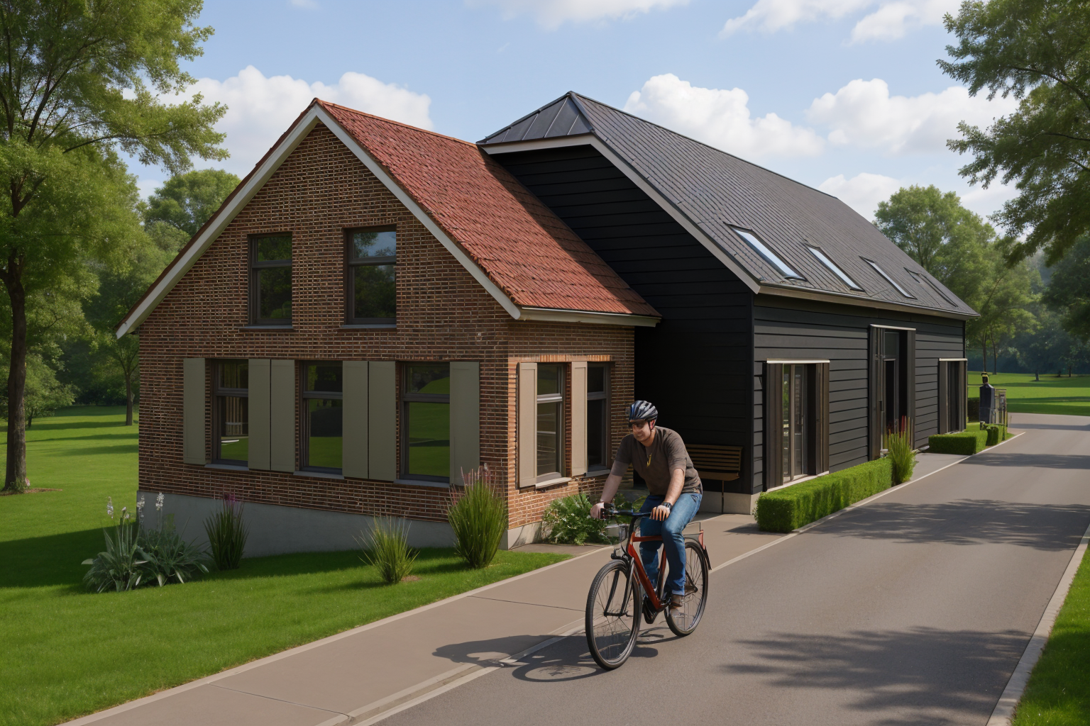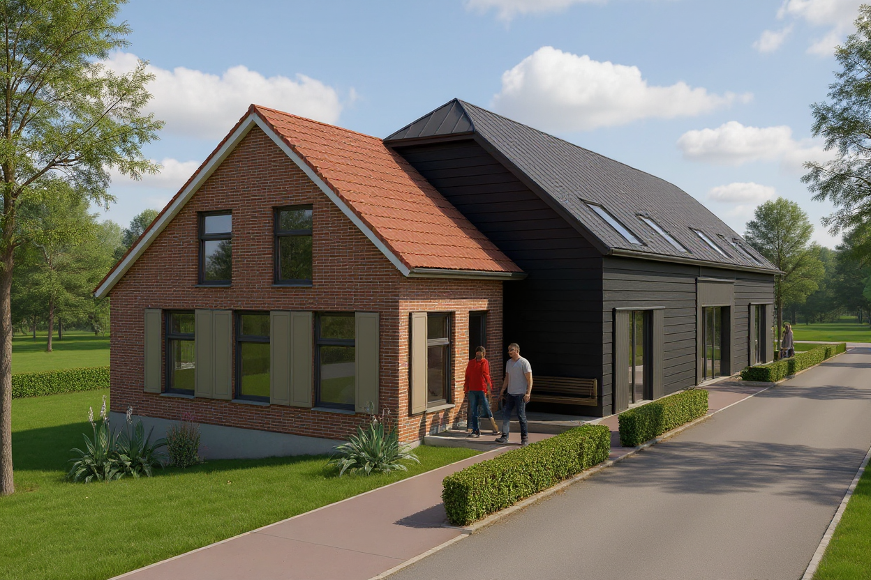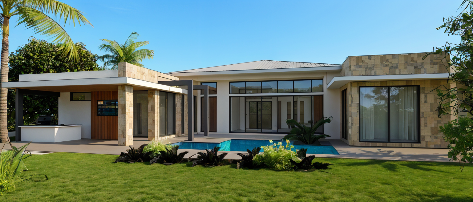 perspective shot make it look in perspective photo real white walls chocolate brown metal roof in a blue sky sunny day beautiful suburban tropical florida landscape architecture