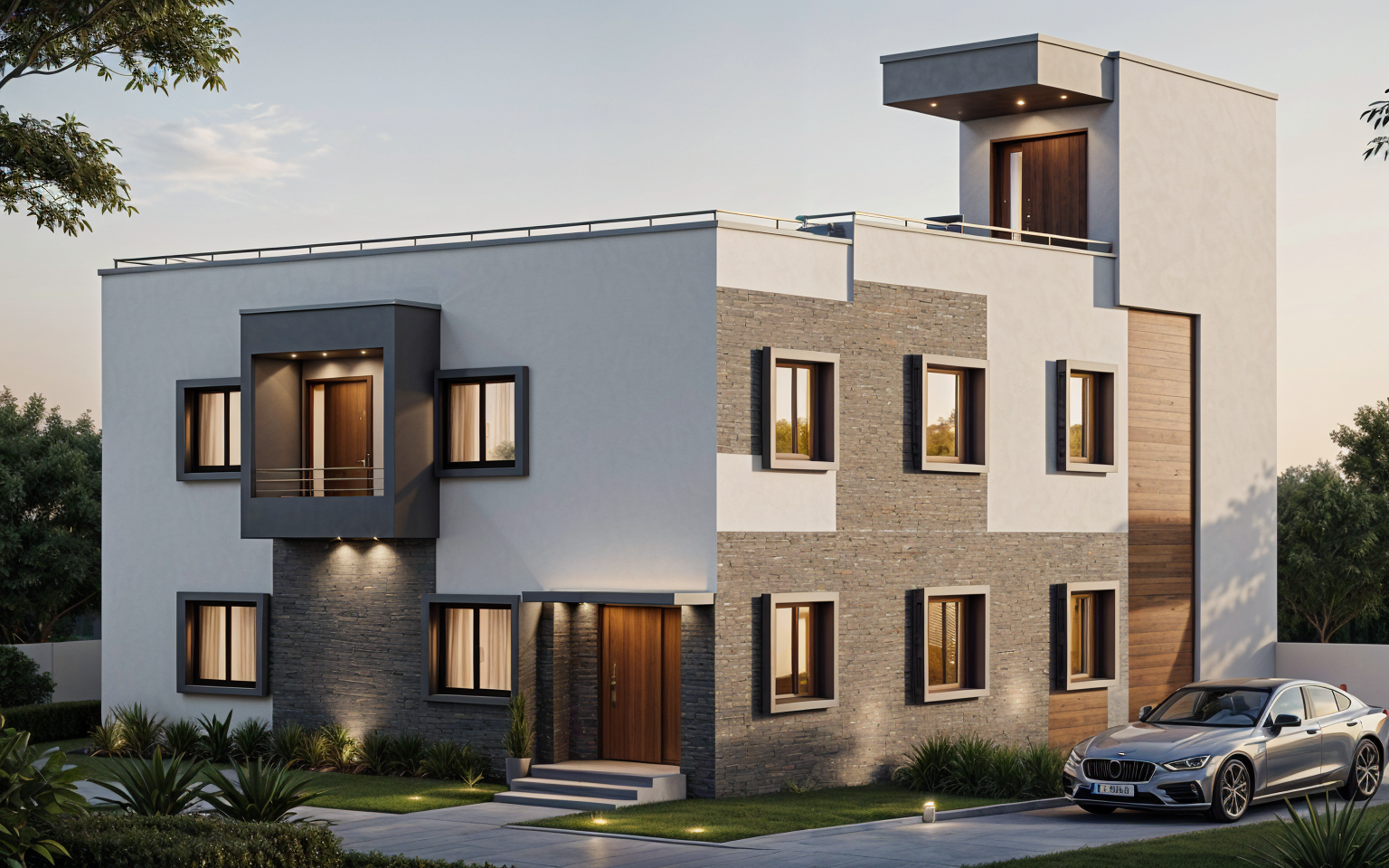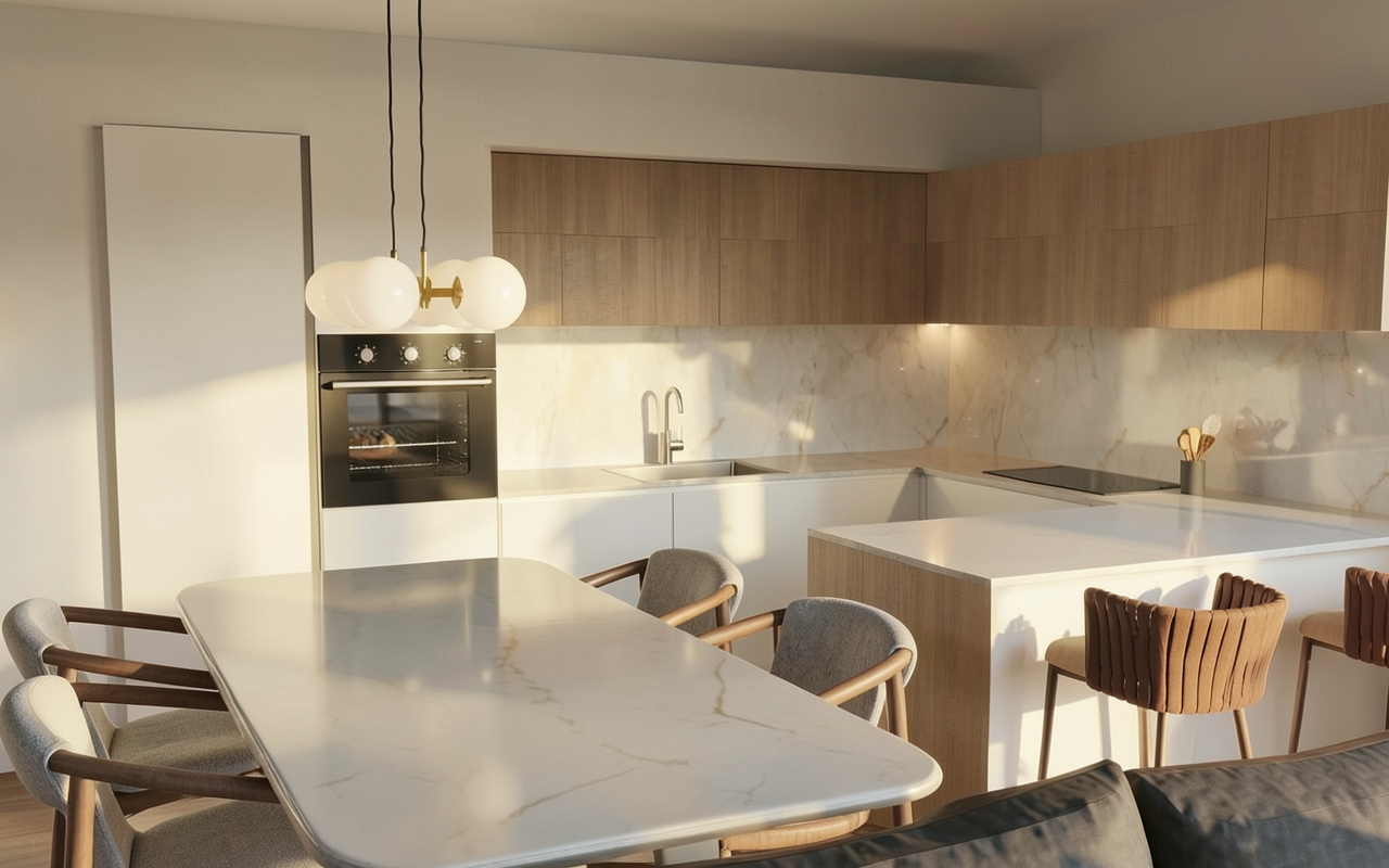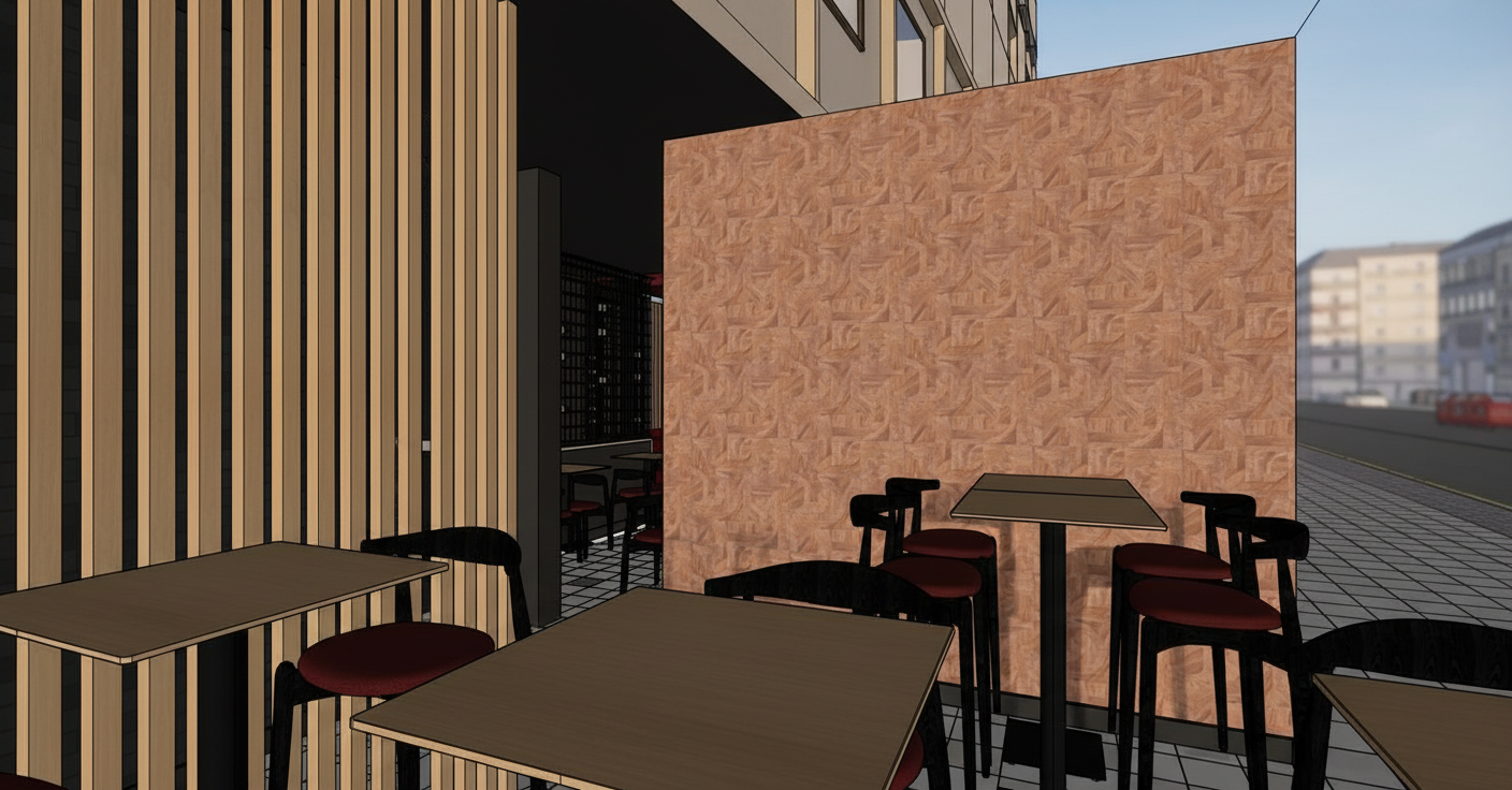 a modern interior with a large plant in the foreground featuring deep green leaves that contrast with a textured woven wall in soft brown the floor is a light warm gray matt tumbled stone the bookcase is a deep redish wood with the shelves having a very soft yellow amber glow lighting up the glasssware and framing the bar the rum bottles are lit up highlighting the alcohol that invite you into the space behind the bookcase are secret speakeasy booths that have a warm glow behind inviting you in everything feels cosy and atmospheric all table lamps are turned on with low lit warm light this is an evening cocktail listening bar the atmosphere is calm and sophisticated with a harmonious blend of natural and modern elements illuminated by gentle ambient lighting
