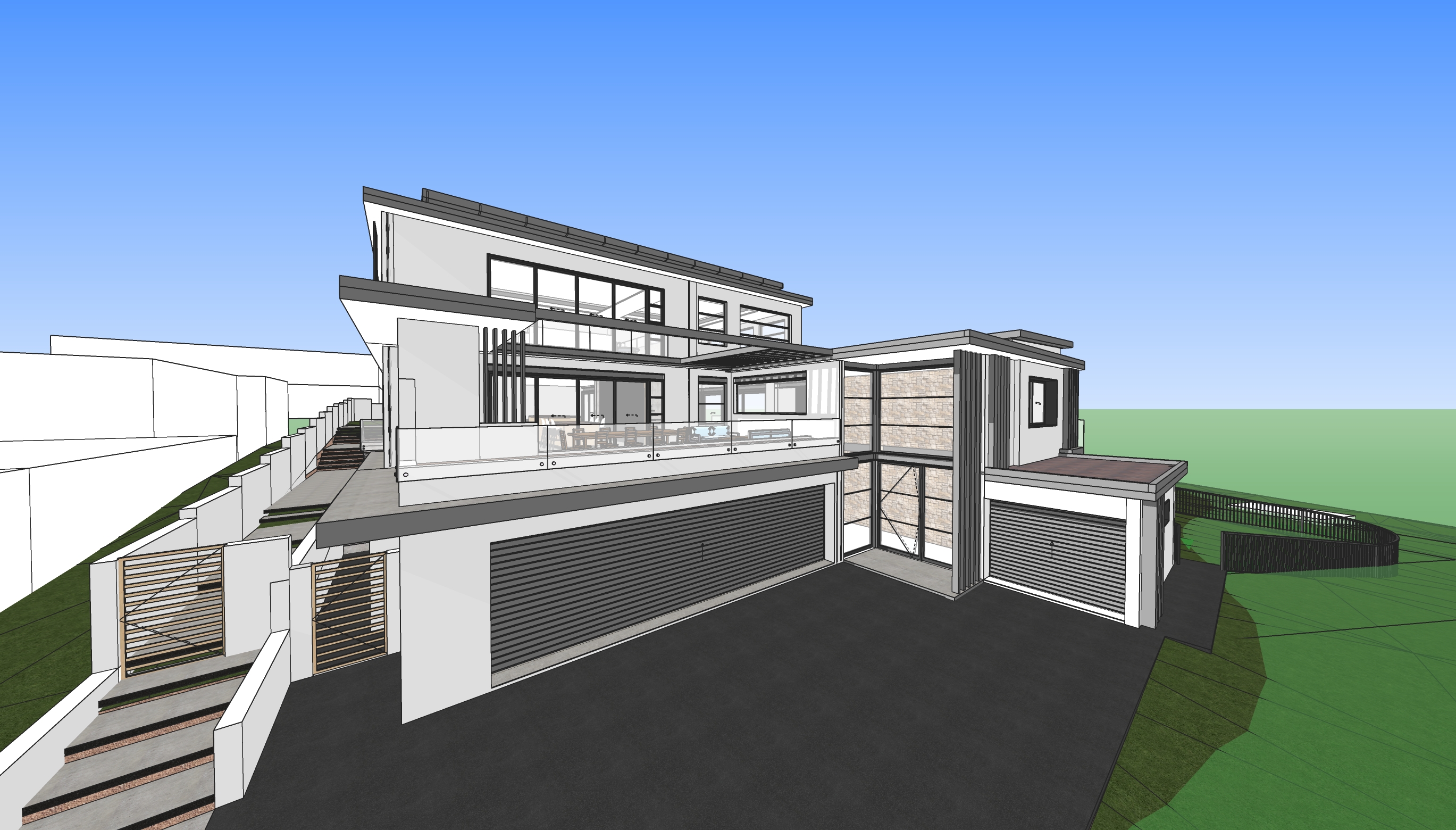 modern exterior shot render a modern multi level house with sleek architectural lines use a palette of crisp white and soft gray for the building exterior with charcoal gray accents incorporate glass railings with metallic frames for a contemporary look the garage doors should feature a dark titanium finish set this against a vibrant blue sky fading into a serene green landscape capture a bright sunny atmosphere with soft shadows enhancing the depth and contours of the structure emphasize a sense of tranquility and modern elegance throughout architecture