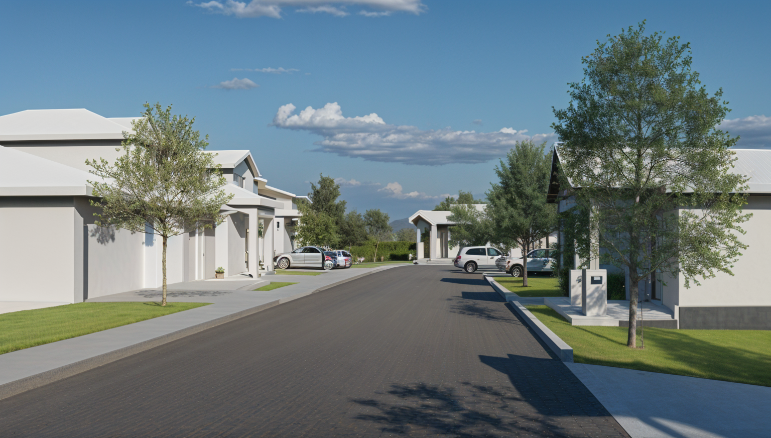 renaissance exterior shot generate a beautiful suburban street scene featuring modern craftsman style houses with brick accents and gray shingle roofs each home should be in the same style with slightly different colors the atmosphere should be serene and inviting with a bright blue sky filled with soft fluffy clouds include lush green trees lining the street casting gentle shadows the road should be a rich smooth dark gray while the sidewalks are a clean light gray add warm natural sunlight to create a tranquil and welcoming neighborhood ambiance architecture