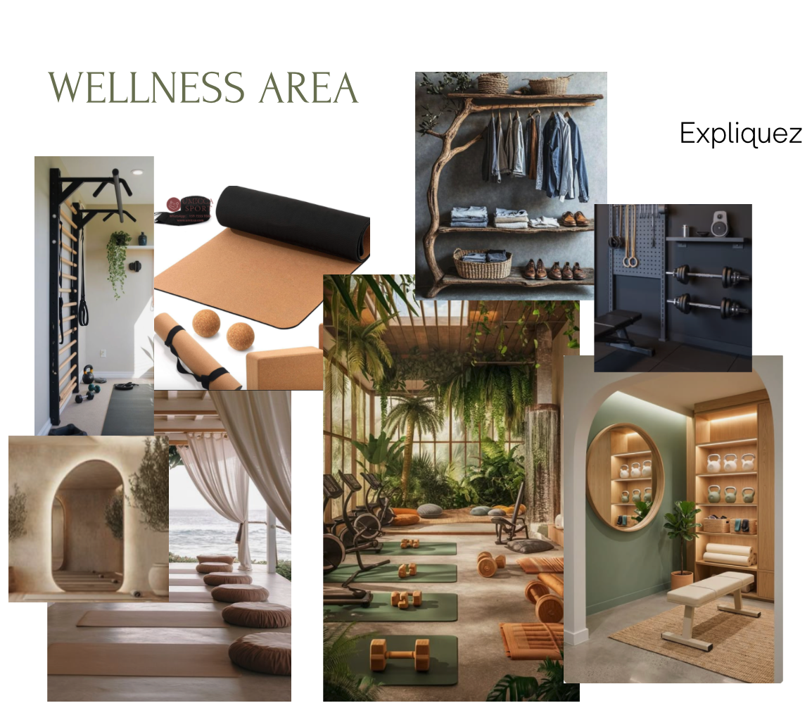 exterior shot this space is a yoga small gym wellness space we will have sage green yoga mats with boho style cushion seating want small weights stepper machine elliptical machine and treadmill can use curtains to separate spaces want to add jamaican greenery plants to keep budget low for design and also using natural elements where possible also include a back lit mirror for that selfie moment at the gym