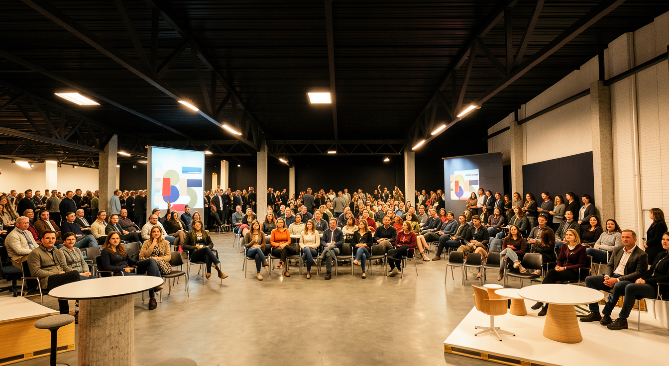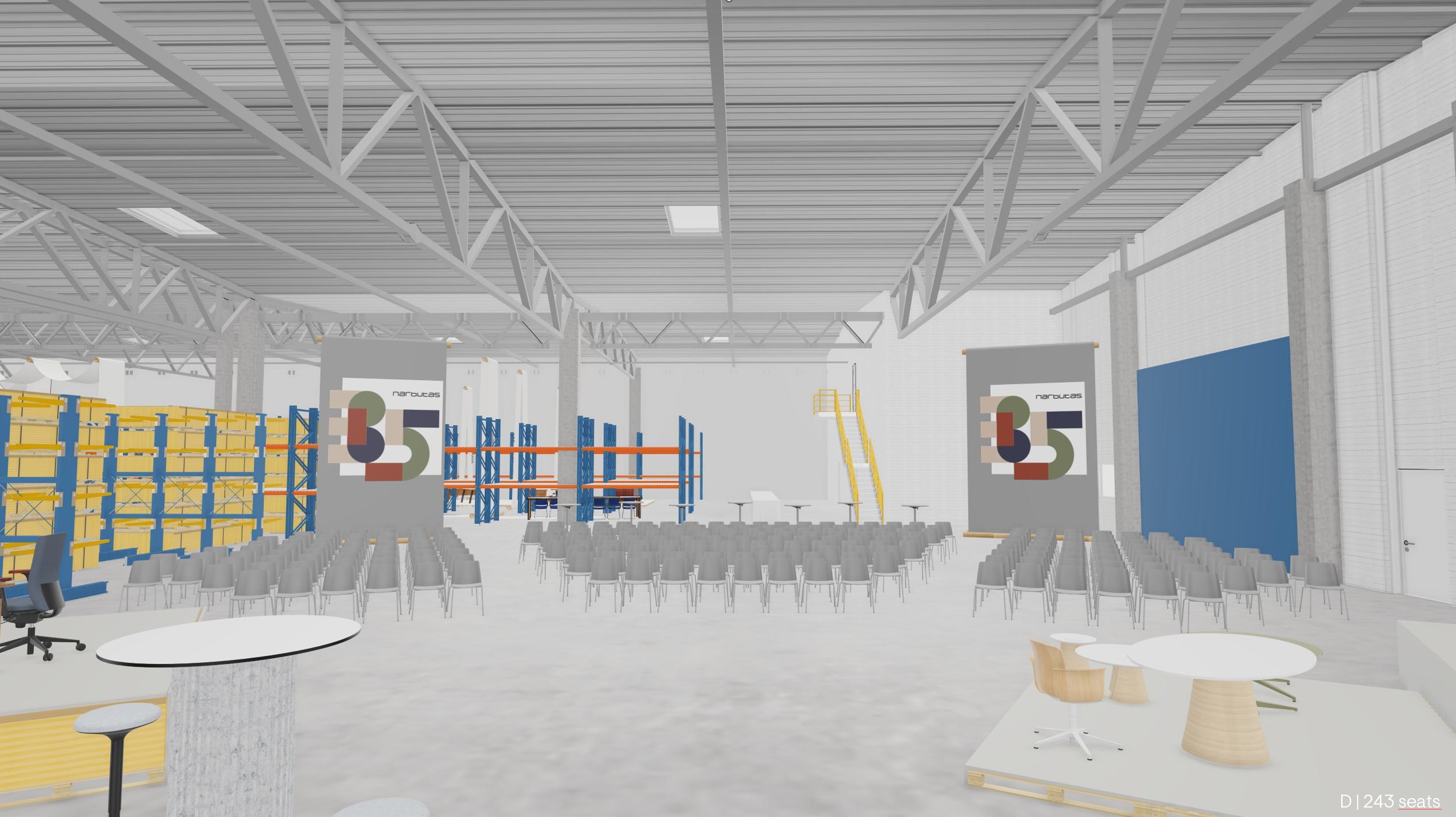 make it look photorealistic make it look like a big event in storage space is happening the space is full of people dark cieling fill all sitting places with people keep the exsisting chair placement add theatre style lighting all people are looking the same direction to camera no people in second plan or sitting on storage shelves keep blue storage shelves