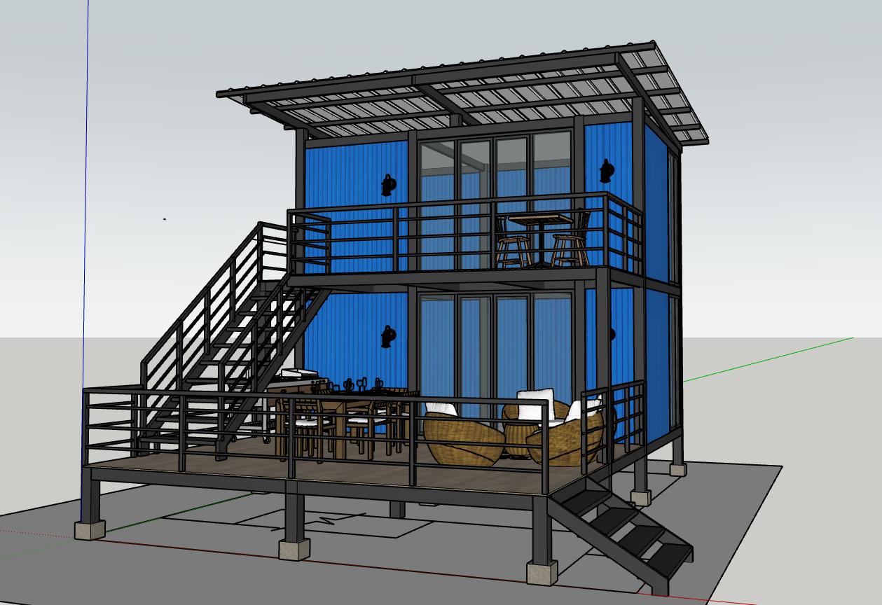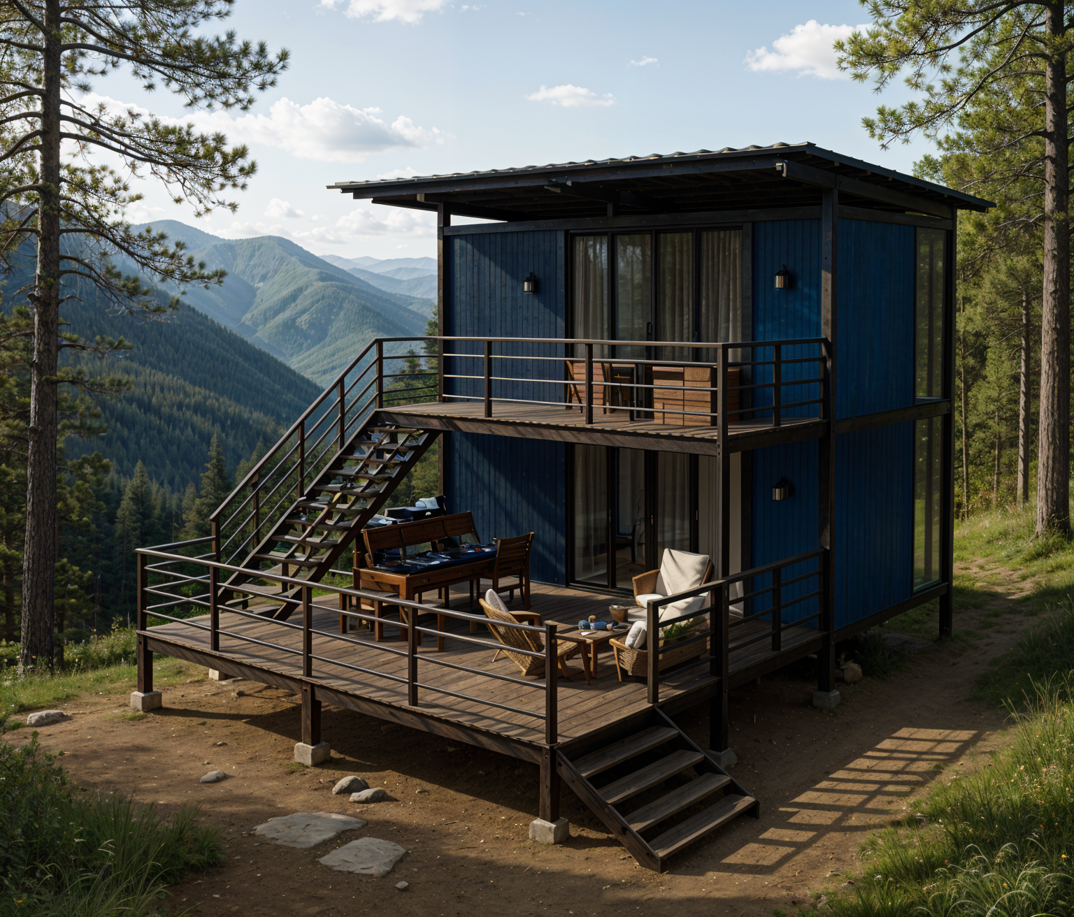 modernist exterior tall trees surrounding house shou sugi ban architecture shot on top of mountain environment bright afternoon on philippine mountains bright clear texture in photo fix railings metal frames add wall lamps add chickens goat and birds