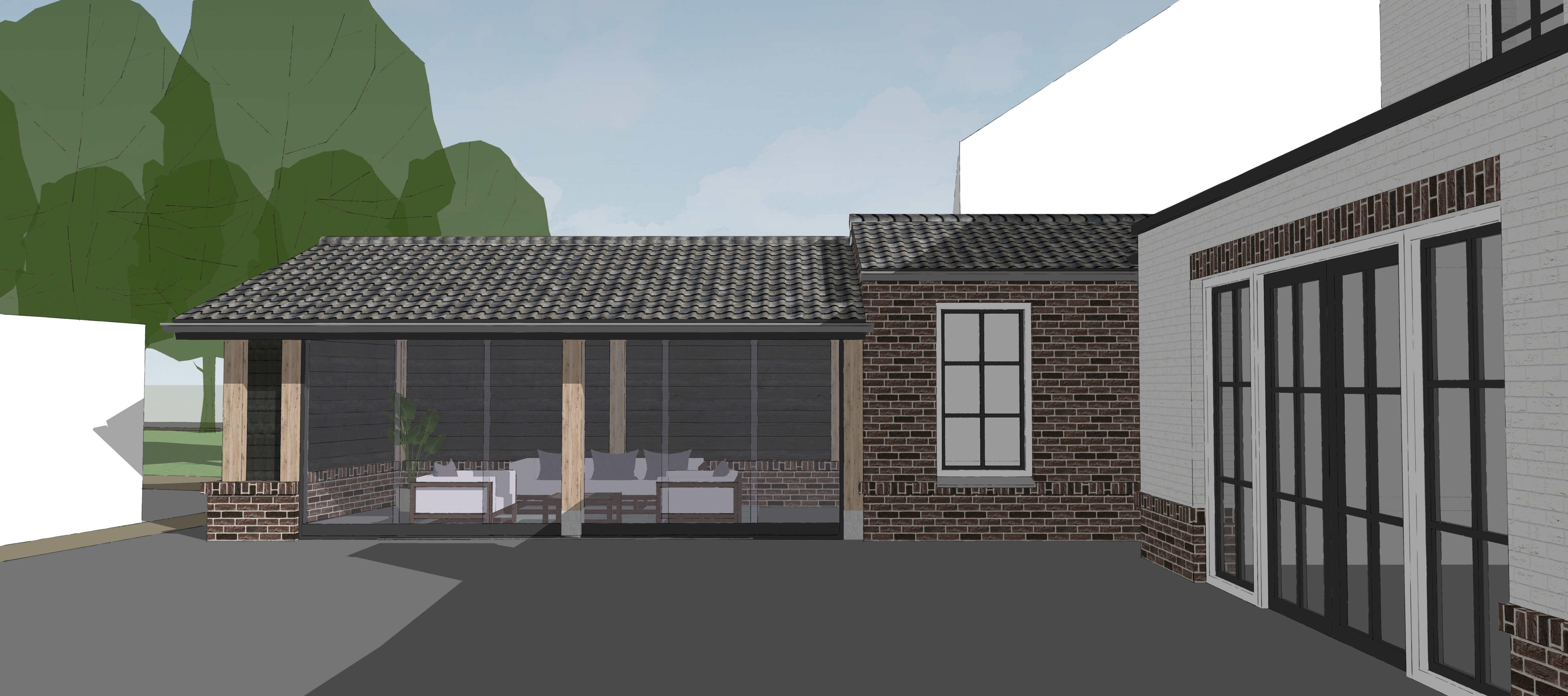 add modern garden with some grass and a wooden fence on the left side