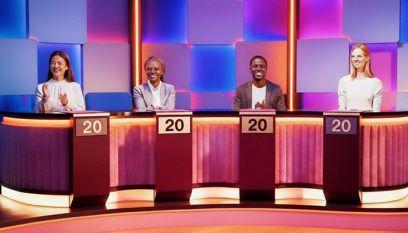 the black squares in the background are blue each individual square in the background consists primarily of blue with purple pink and orange tones the shadows are black the entire image is more saturated the vertical led line in the background emit an orange light the light under the desk have a warm glow vibrant colors highly saturated high contrast the color of the desk will be retained increase color saturation enhance contrast make the colors more vibrant while maintaining the architectural forms the light on the persons face remains the same as in the original photo do not change or add new structural elements there is no floor no dark shadow in the back no black in the background