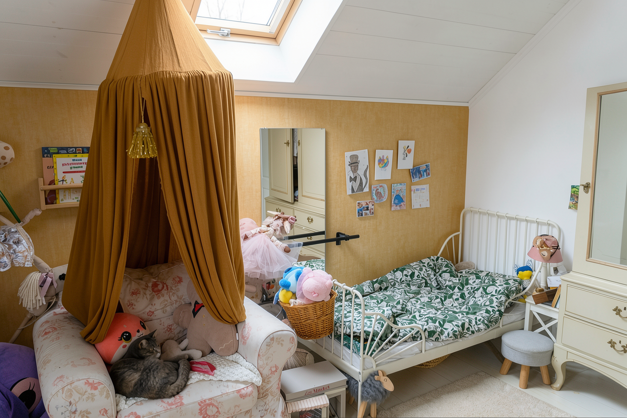 replace wallpaper with different light warm yellow wallpaper keep the right side wall white remove ochre hanging tent