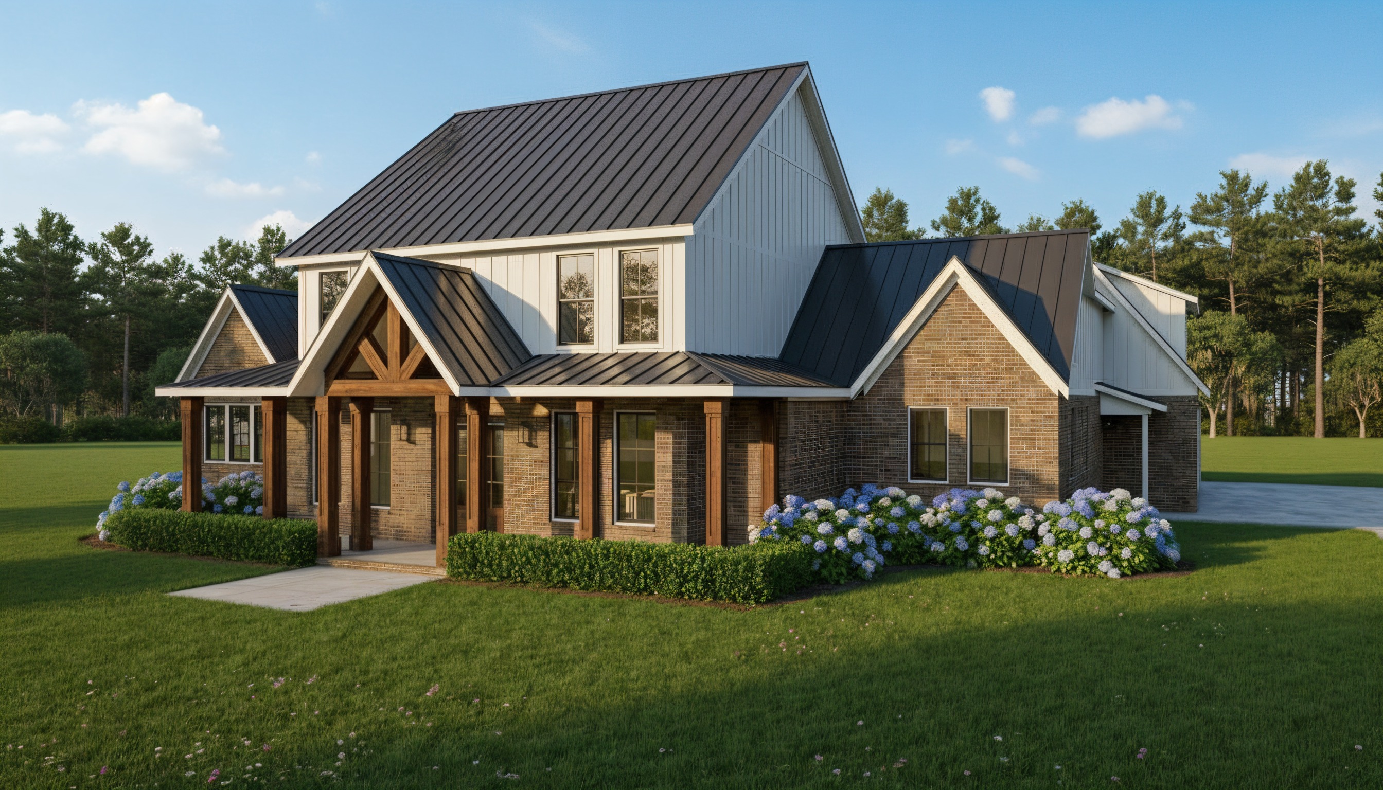 keep all elements exactly as is with the exception of changing the vertical siding to horizontal siding keep the front porch roof metal but change the main house roof to shingles