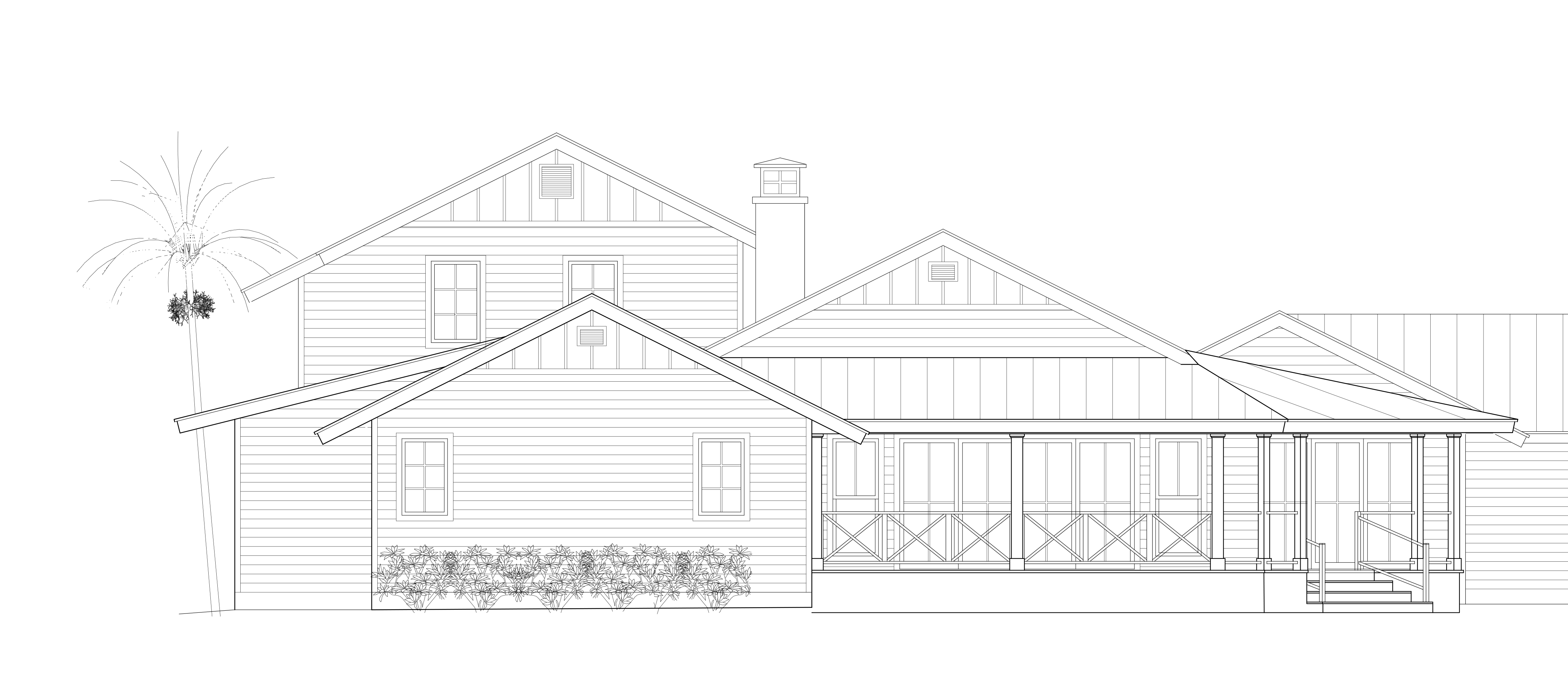 generate a beautiful realistic architectural rendering key west style tropical florida lush landscaping white and light blue siding white windows and trim screened porch metal roof pool in foreground white chimney