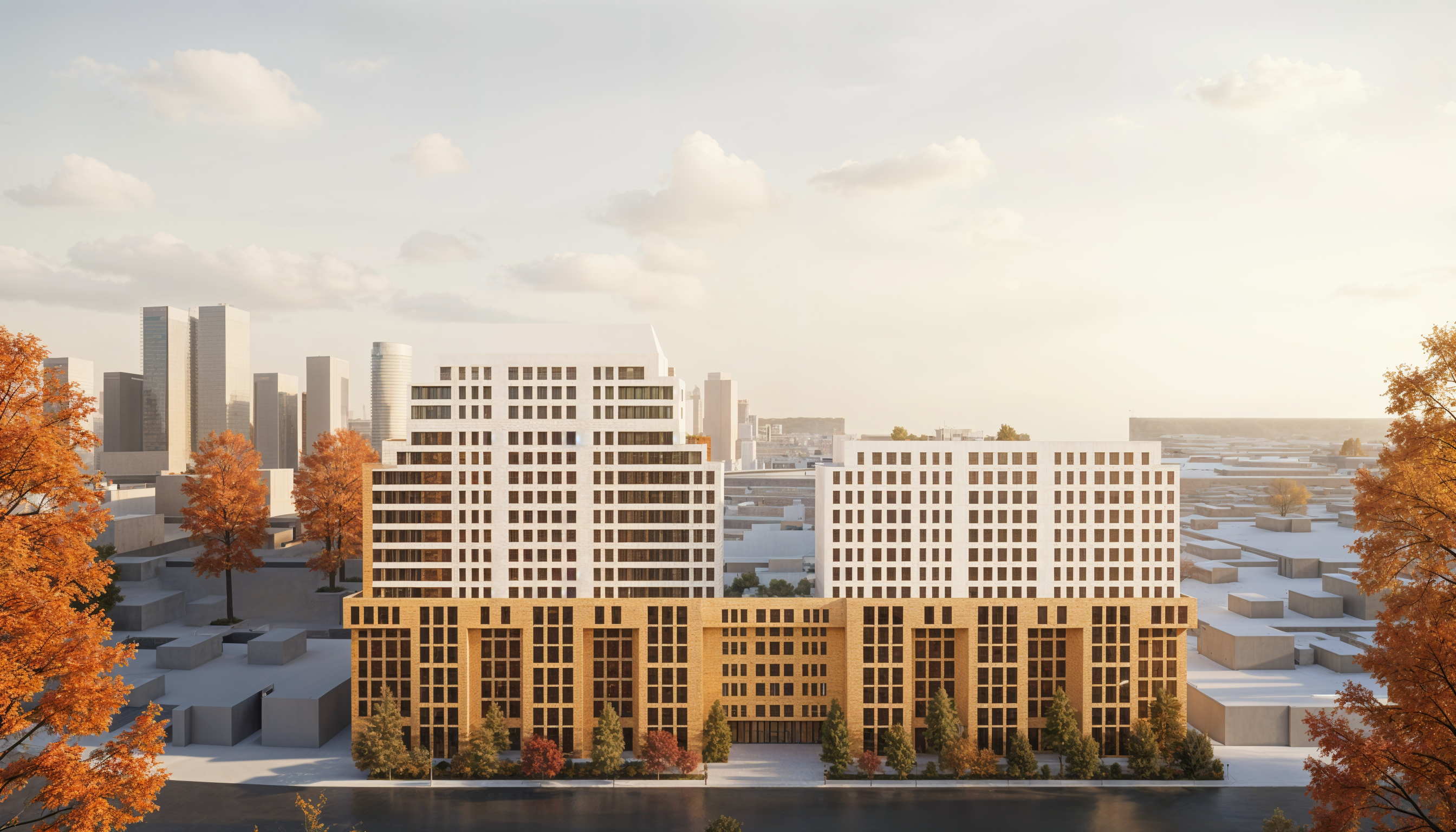 make this a more photo realistic scene with real building material finishes add cars on the road