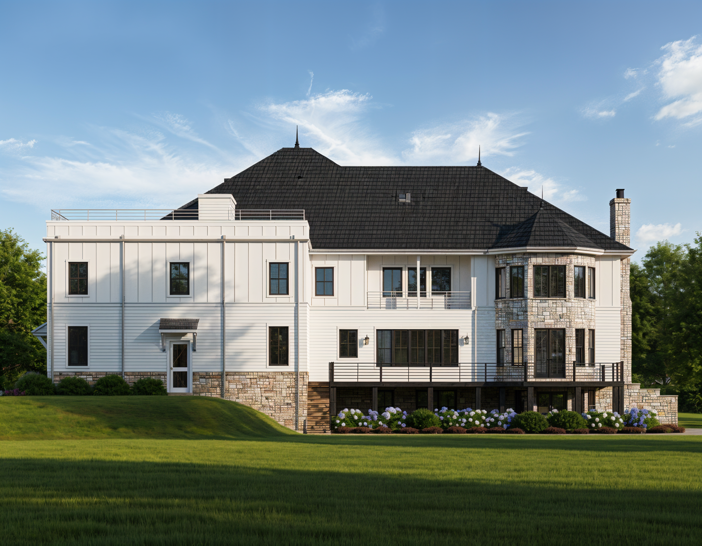 the brick and stone will be white wash finish the roof shingles and windows will be black the lap siding and borad batten will be white all railings will be black