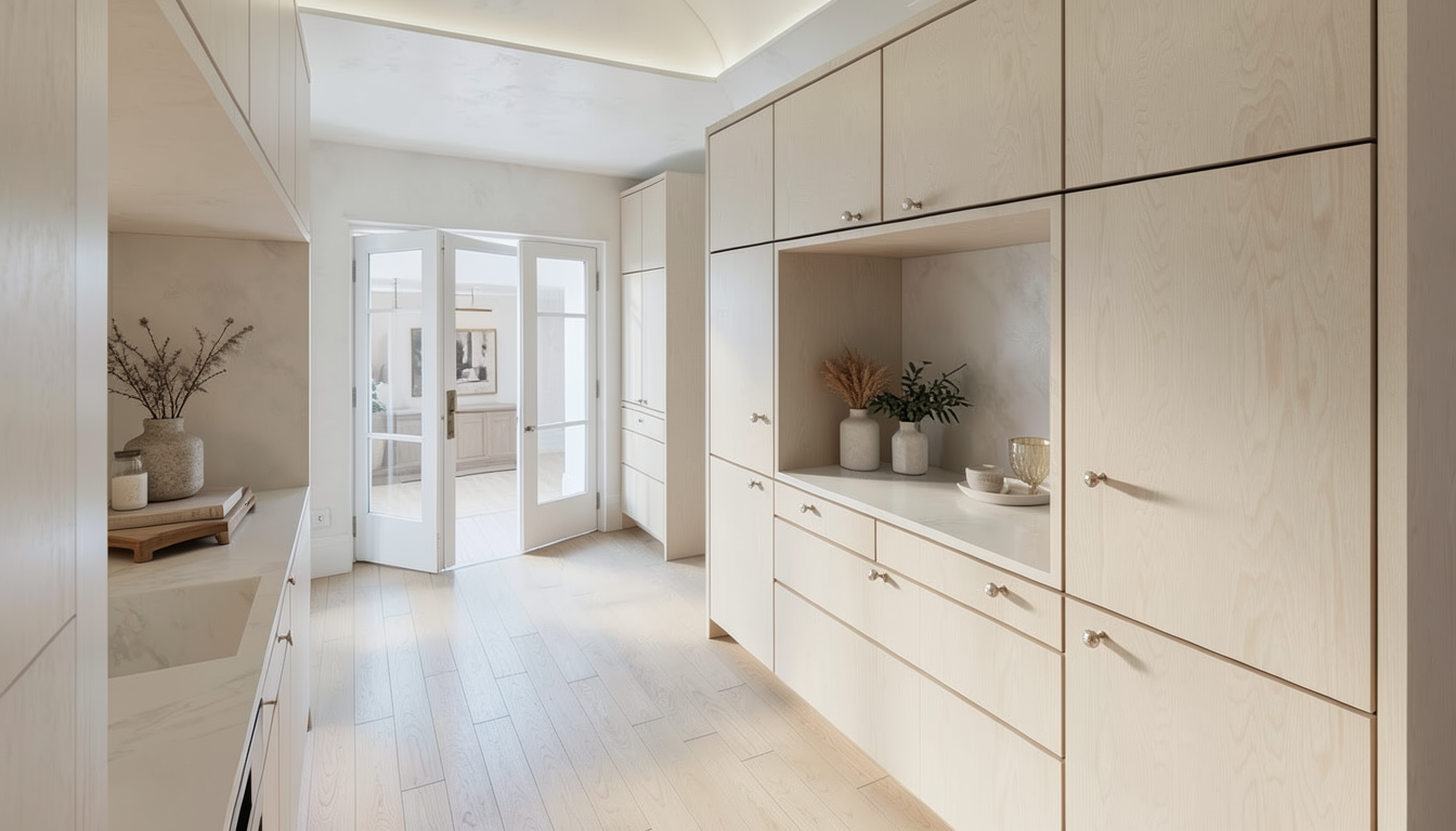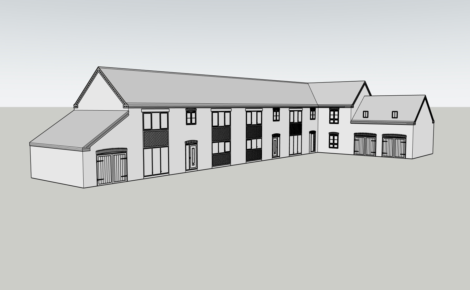 create uk brick style barn conversion with light grey windows driveways to front of house with cars on drive landscaping to the surrounding areas blue sky light cloud summer afternoon with natural ambiant lighting