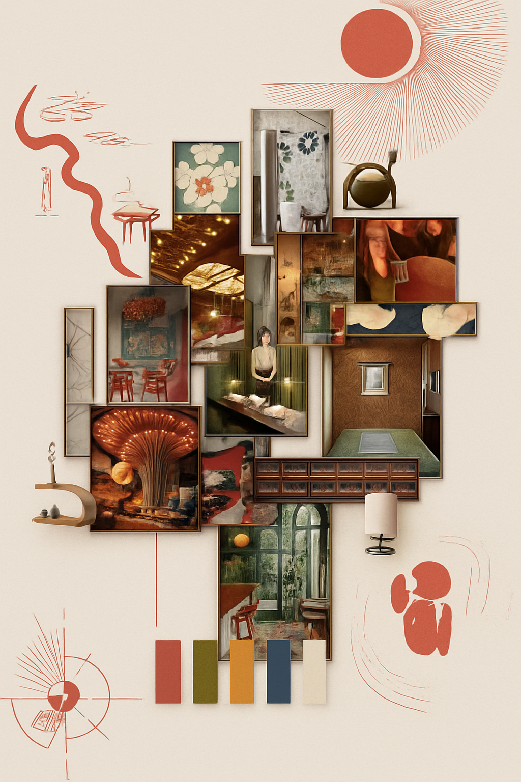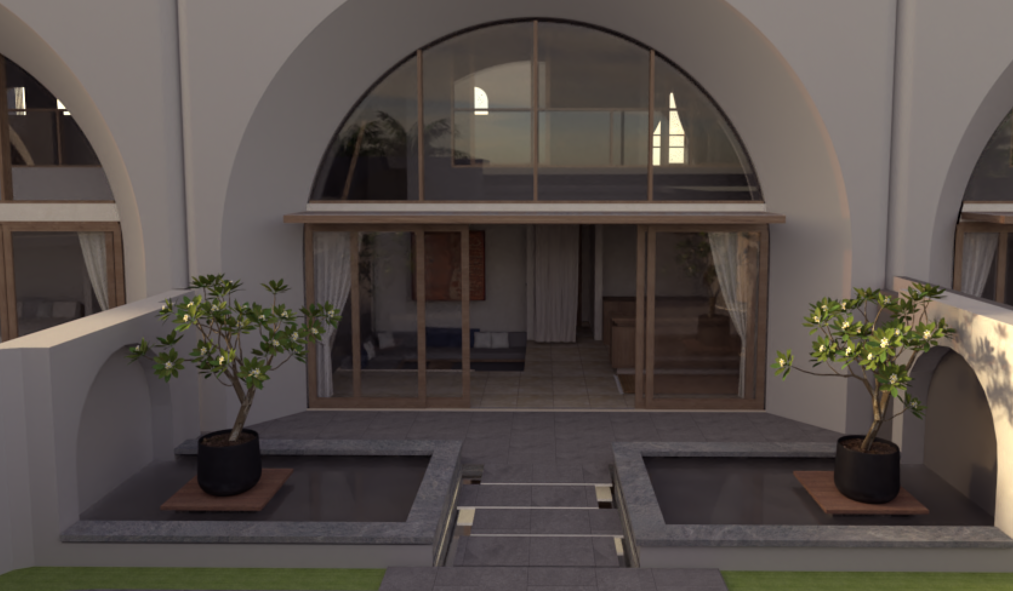 boutique hotel facade view showing floating walkway over water with lights under the stone slabs reflecting off water below the walkway goes between 2 water features in bali evoking mystery and atmosphere