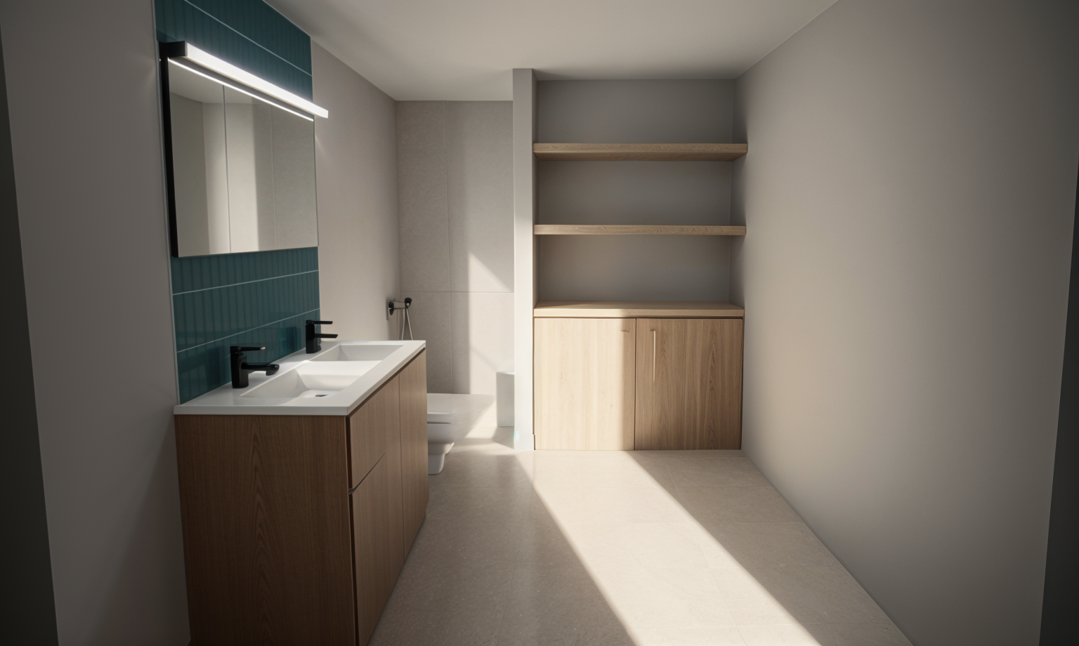 modern interior shot a modern bathroom with a minimalistic and elegant style render the scene with soft warm lighting to create a cozy and inviting atmosphere use a soft shadow effect to emphasize depth and warmth in the entire space architecture
