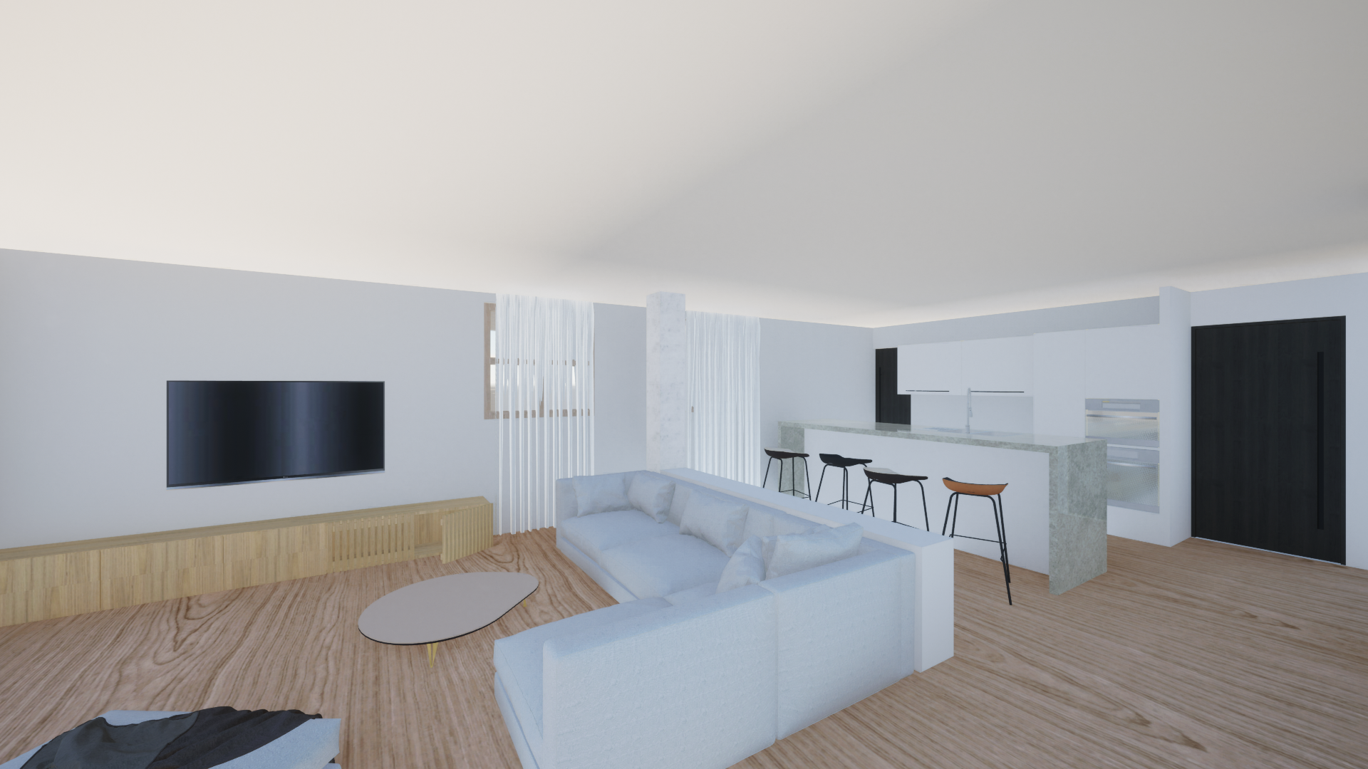crate a photorealistic 3d image of this modern space keep all the floor colour light wood